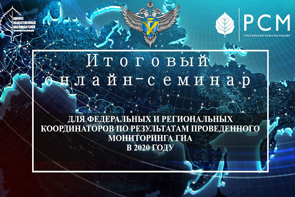 Состоялся итоговый онлайн-семинар по результатам мониторинга проведения государственной итоговой аттестации 2020 года по образовательным программам основного общего и среднего общего образования. В семинаре приняли участие начальник Управления организации и проведения государственной итоговой аттестации Рособрнадзора Игорь Круглинский и председатель Российского союза молодежи Павел Красноруцкий. Они поприветствовали участников семинара и поблагодарили за слаженную и продуктивную деятельность в ходе мониторинга ГИА в этом году. С докладом по итогам работы Корпуса общественных наблюдателей выступила руководитель проекта Марина Задорожнева. Несмотря на все трудности, связанные с эпидемиологической ситуацией, общественные наблюдатели смогли осуществить качественный и объективный мониторинг в пунктах проведения экзамена.