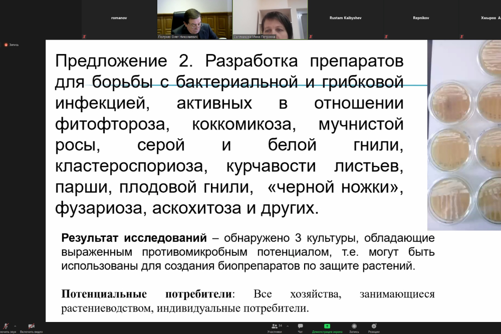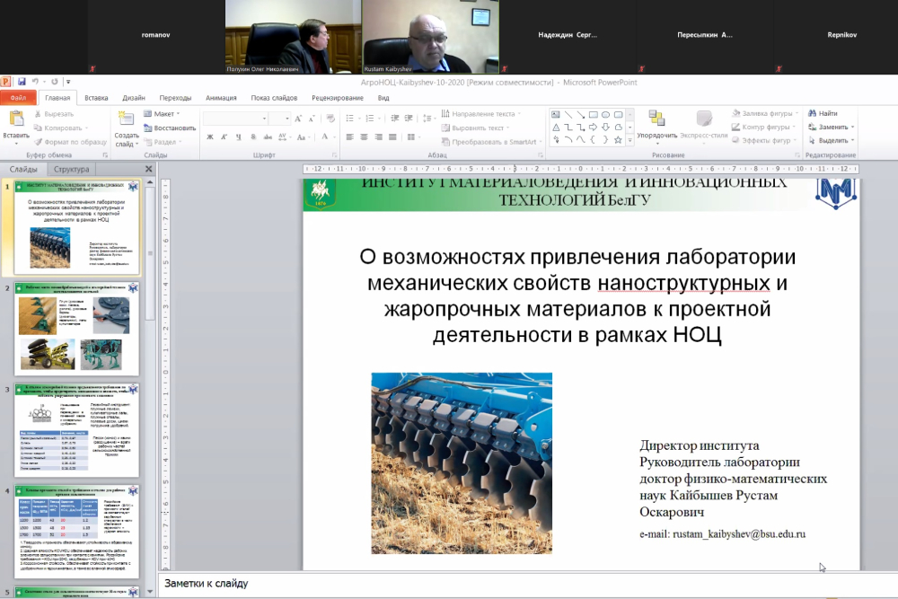 Руководители научных подразделений вуза Рустам Кайбышев и Инна Соляникова высказали предложения по привлечению возглавляемых ими подразделений к деятельности в рамках НОЦ. Перспективным проектом, по мнению Рустама Оскаровича может стать получение новых сталей для рабочих органов сельскохозяйственной техники. У руководимой им лаборатории механических свойств наноструктурных и жаропрочных материалов есть все возможности для удешевления сталей и упрощения технологии изготовления рабочих элементов сельхозтехники при сохранении её надежности. По словам Инны Петровны, предлагаемые региональным микробиологическим центром проекты, в частности, препараты для очистки нефтезагрязнений, весьма перспективны и имеют потенциальных заказчиков.