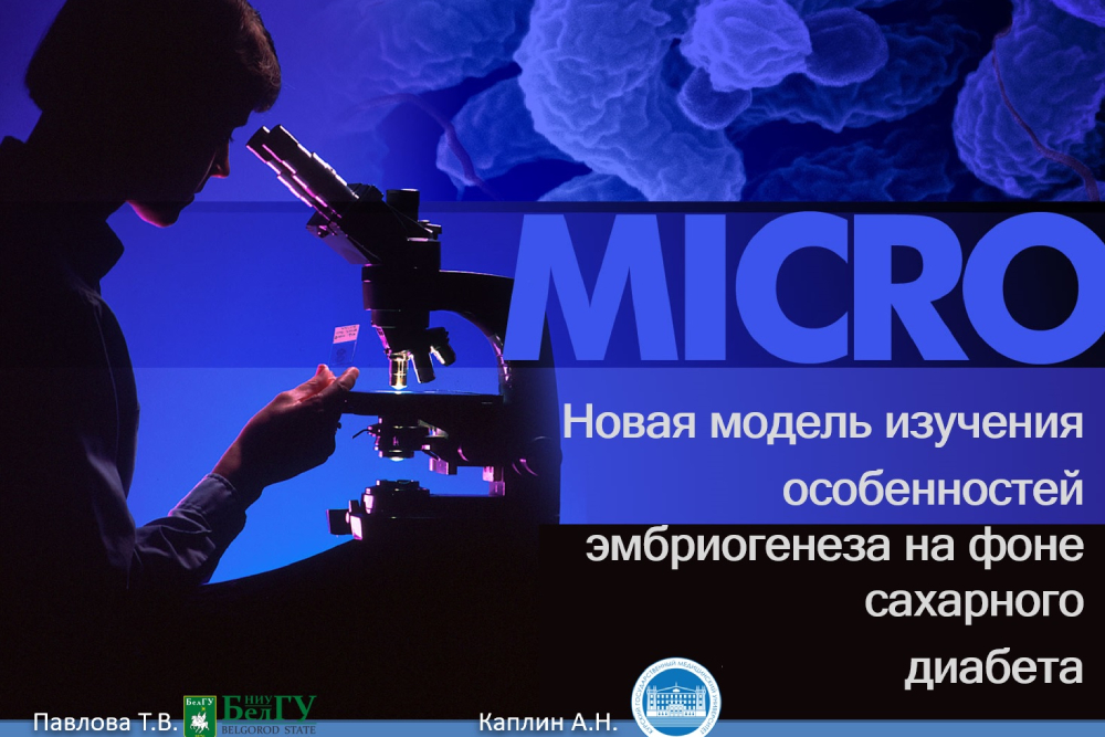 Второе сообщение было посвящено исследованию «Новая модель изучения особенностей эмбриогенеза на фоне сахарного диабета», выполненному совместно с докторантом кафедры Курского государственного медицинского университета Антоном Каплиным. В нём изучается развитие плода и новорожденного на фоне сахарного диабета у матери в экспериментальной модели.
