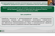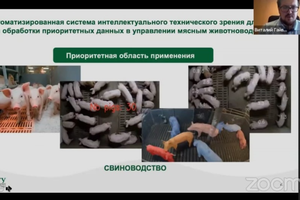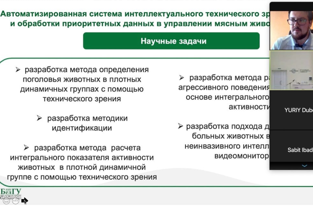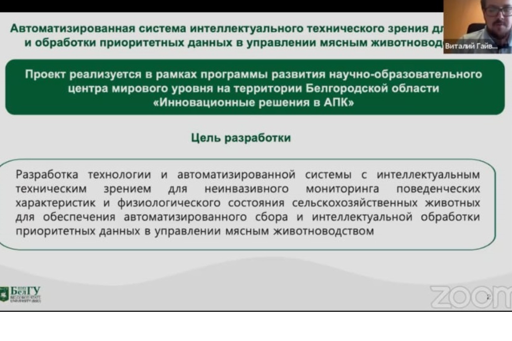 Ассистент кафедры математического и программного обеспечения информационных систем Виталий Гайворонский представил проект, реализуемый коллективом учёных НИУ «БелГУ» под руководством доктора технических наук, профессора Ольги Иващук. Проект направлен на создание автоматизированной системы интеллектуального технического зрения для неинвазивного мониторинга поведенческих характеристик и физиологического состояния сельскохозяйственных животных, находящихся в плотных динамичных группах. По словам Виталия Александровича, новая система обеспечивает автоматизированный сбор и интеллектуальную обработку приоритетных данных в управлении мясным животноводством.