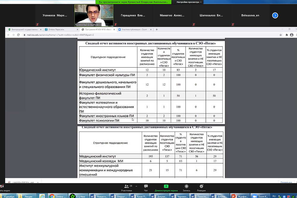 На рабочем совещании обсуждался вопрос организации учебного процесса в условиях повышенного риска распространения коронавирусной инфекции. Как отметил начальник департамента образовательной политики Александр Немцев, посещаемость студентов и преподавателей в системе «Пегас» держится на высоком уровне. Были заслушаны сообщения руководителей структурных подразделений университета о готовности к проведению зимней сессии. По словам директора педагогического института Виктории Тарабаевой, во время летней сессии накоплен положительный опыт проведения консультаций, зачётов и экзаменов в режиме онлайн. В институте всё готово для проведения зимней сессии, которая начнётся 10 декабря. Директор института инженерных и цифровых технологий Константин Польщиков напомнил, что в университете из числа студентов сформирован отряд цифровых волонтёров, которые в случае необходимости оказывают техническую поддержку преподавателям и студентам.