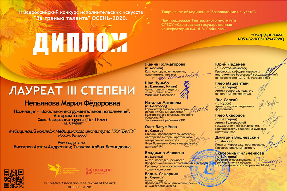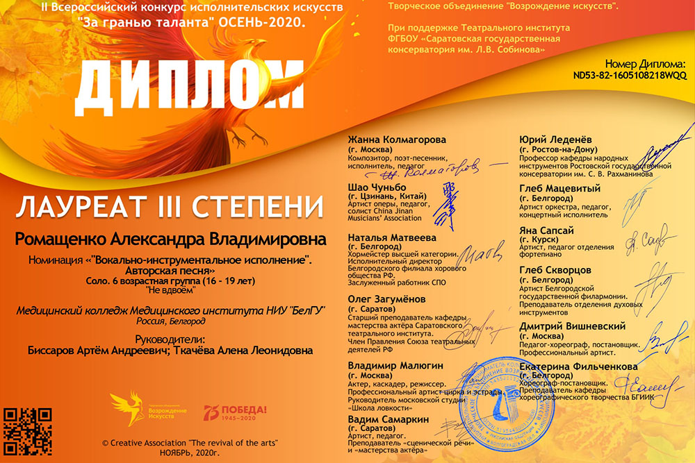 Студентки медицинского колледжа НИУ «БелГУ» стали лауреатами Всероссийского конкурса исполнительных искусств «За гранью таланта»