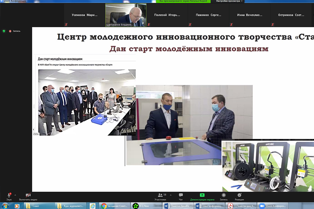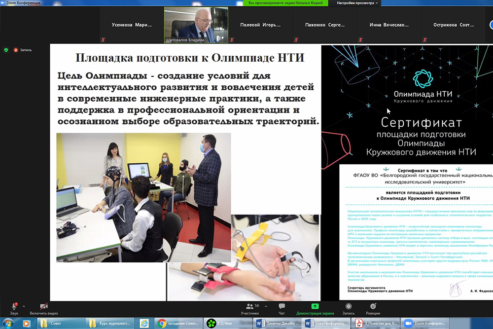 В заседании совета, которое прошло в дистанционном формате, принимали участие представители руководства вуза и руководители структурных подразделений. На повестку был вынесен вопрос о дополнительном образовании детей и школьников в НИУ «БелГУ» в контексте профориентационной работы. Проректор по качеству и дополнительному образованию Владимир Шаповалов рассказал, что работа ведётся с обучающимися общего и среднего профессионального образования. В систему дополнительного образования НИУ «БелГУ» входят Центр глобально-ориентированного образования дошкольников «Ноосфера», Открытая инжиниринговая школа, Центр компьютерного образования, Центр иноязычного образования и академического письма, Центр развития интеллектуальных видов спорта и другие структурные подразделения, позволяющие развивать способности детей в науке, спорте и творчестве.