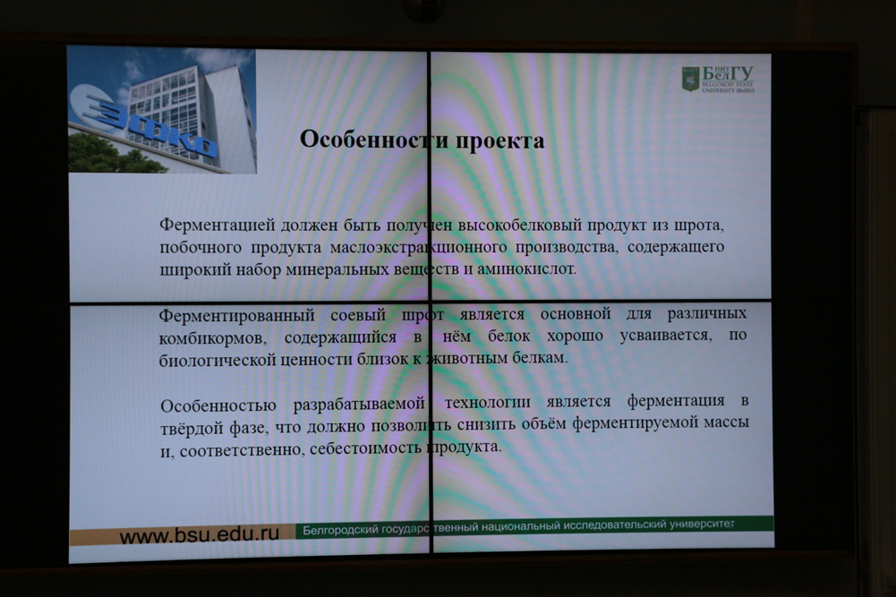 Заведующая кафедрой биотехнологии и микробиологии Ирина Батлуцкая рассказала о двух проектах, которые реализуются под её руководством в рамках научно-производственной платформы НОЦ «Биотехнология», оценив их перспективы. Серьёзный блок молекулярно-генетических исследований проекта «Разработка конкурентоспособной технологии по производству аминокислоты L-треонин, по словам Ирины Витальевны, учёные готовы проводить на площадке университета. Директор ЗАО «Завод премиксов №1» Алексей Балановский, выразил заинтересованность в дальнейшей реализации этого проекта совместно с НИУ «БелГУ».