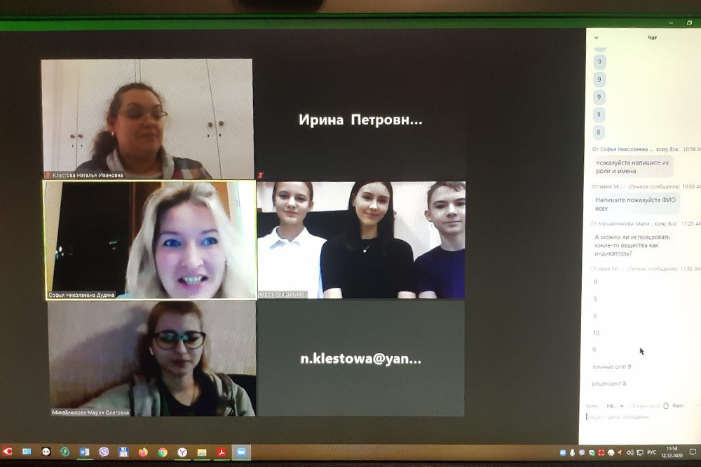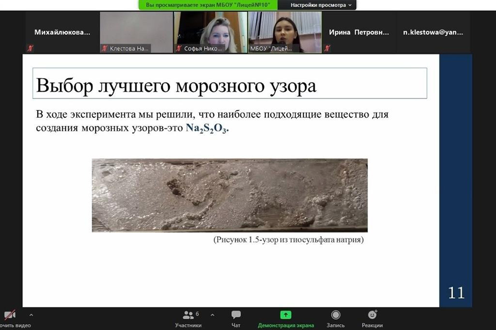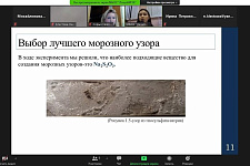 В ходе обсуждений была представлена модель «умной посуды» для распознавания содержания в пище вредных веществ. Индикаторную посуду активно обсуждали рецензент, оппонент и докладчик, свои идеи внесли на рассмотрение и члены жюри. Интересными были результаты экспериментальной работы учащихся по «рисунку на стекле». Команды представили фото морозных узоров, выполненных с применением большого количества реактивов, а также дали рекомендации по приготовлению растворов и технике нанесения.