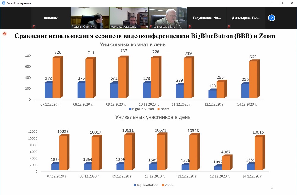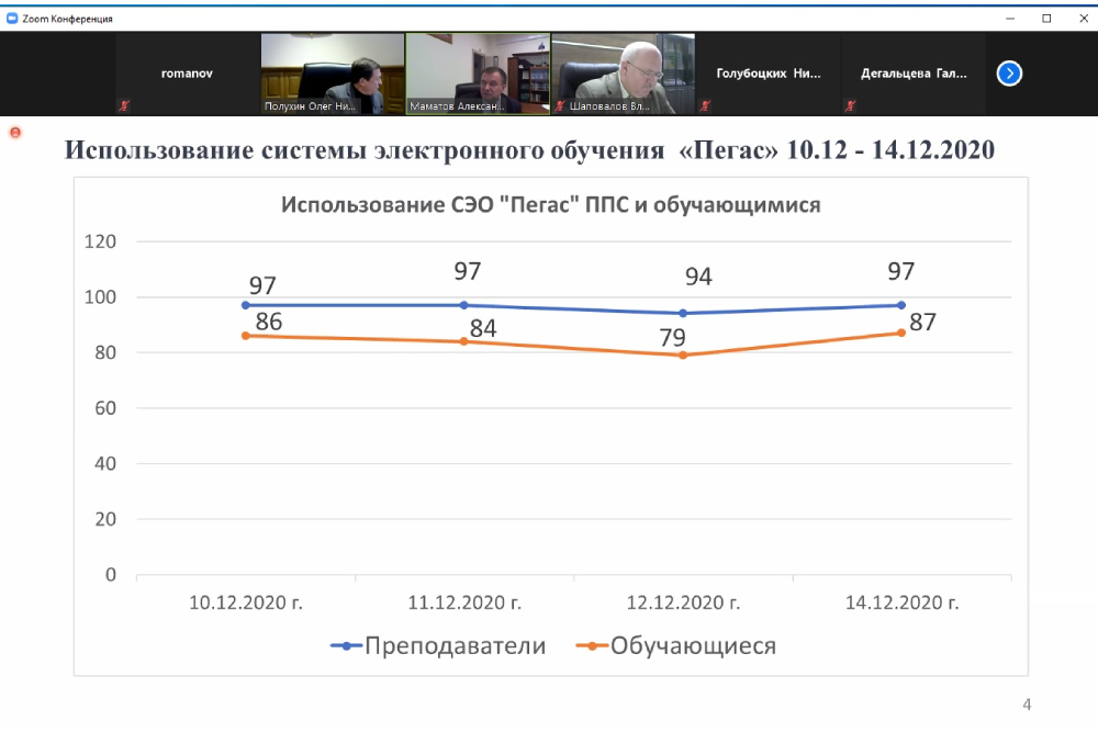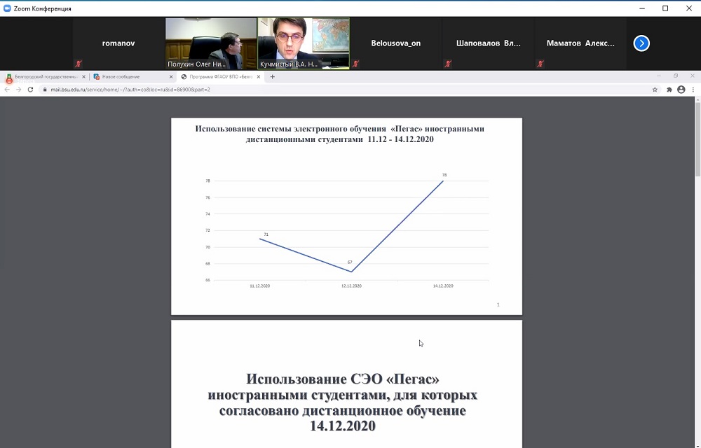 Заседание проходило в режиме онлайн под руководством ректора НИУ «БелГУ», профессора Олега Полухина. Об организации учебного процесса в условиях повышенного риска распространения новой коронавирусной инфекции COVID-19 доложил проректор по образовательной деятельности Александр Маматов. По словам Александра Васильевича, занятия проводятся в смешанном формате с преимущественным дистанционным обучением. Для проведения зачётов, консультаций и экзаменов в режиме видеоконференцсвязи в университете подготовлены аудитории-студии. Ректор обратил особое внимание на качество ведения образовательной деятельности в дистанционном формате и дал поручение проработать возможные варианты дополнительных занятий по тем дисциплинам, где высока доля практической подготовки.