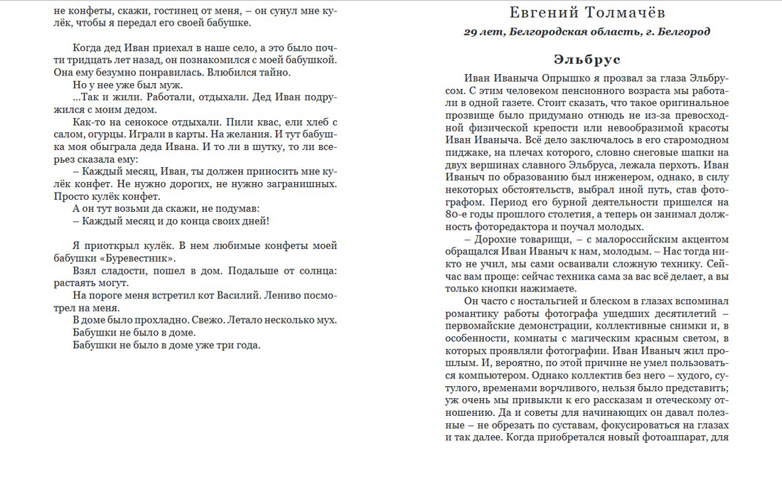Корреспондент управления по связям с общественностью и СМИ НИУ «БелГУ» Евгений Толмачёв участвовал в категории авторов в возрасте от 25 до 30 лет и занял третье место. В декабре составлен сборник лучших коротких рассказов 2020 года, в который вошёл рассказ Евгения «Эльбрус». Всего в сборнике представлено 29 рассказов.