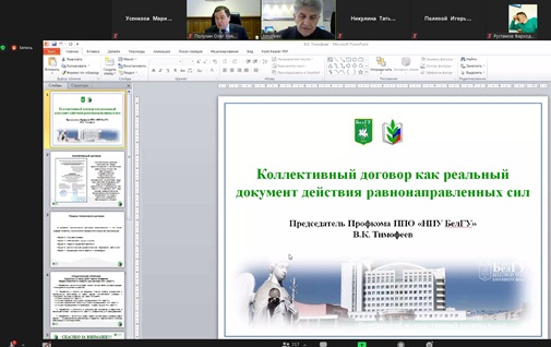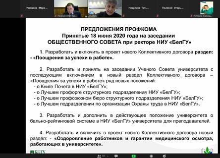 Об утверждении отчета об исполнении коллективного договора на 2018-2020 годы доложил председатель профкома ППО НИУ «БелГУ» Валерий Тимофеев. Валерий Кузьмич акцентировал внимание на взаимодействии профкома и администрации университета по выполнению всех разделов коллективного договора. О внесении дополнений в новый коллективный договор рассказала начальник правового управления Людмила Иванова. В частности, она сообщила о новом разделе «Поощрения за успехи в работе», а также о внесении изменений в соответствии с законодательством по переводу на удалённую работу и дистанционное обучение.
