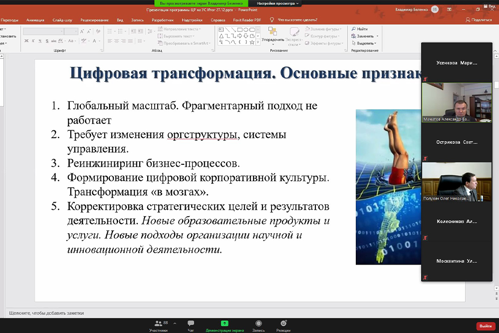 - Цифровое развитие – это уже сегодняшний день университета. Конечно, нам нужно думать о перспективах, но каждый год конкретизировать задачи и актуализировать дорожную карту с учётом важных для нас направлений. Нам нужен конкретный план действия. Все высказанные сегодня предложения необходимо внести в программу и в начале следующего года определить окончательный объём финансирования на 2021 год, - резюмировал Олег Николаевич.