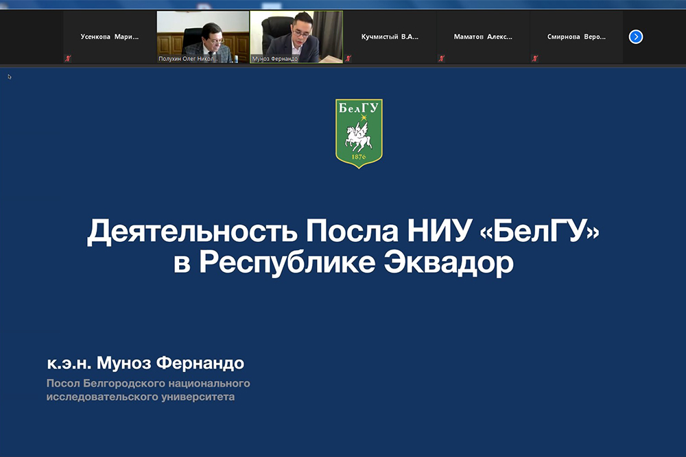 Сообщил проректор об активном продвижении бренда НИУ «БелГУ» в социальных сетях и работе послов вуза. В частности, он отметил успехи в привлечении студентов из стран Южной Америки рекрутинговой компании «Имекса», руководителем которой является посол НИУ «БелГУ» в Эквадоре Муньос Андраде Луис Фернандо. Луис Фернандо рассказал о деятельности компании, сотрудничестве с НИУ «БелГУ», главным результатом которого стало привлечение за последние два года 375 иностранных студентов из стран Южной Америки, лидирующих позициях компании в продвижении русского языка и российского образования на американском континенте. Говоря о перспективах, посол НИУ «БелГУ» сообщил, что к 2025 году ставится задача – привлечь в НИУ «БелГУ» более трёх тысяч иностранных студентов.