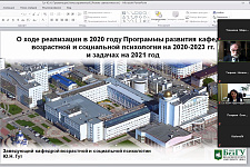 Перспективы взаимодействия с кафедрой в образовательной и научной деятельности оценил внешний эксперт, заведующий лабораторией дифференциальной психологии и психофизиологии ФГБНУ «Психологический институт» РАН Мухамед Кабардов. Важным направлением сотрудничества он назвал подготовку педагогических кадров, повышение квалификации преподавателей. Мухамед Каншобиевич обратил внимание на возможность проведения совместных фундаментальных исследований и подготовку публикаций в журналах. Совет утвердил актуализированную программу развития кафедры возрастной и социальной психологии на 2020-2023 гг. и план мероприятий на 2021 год.