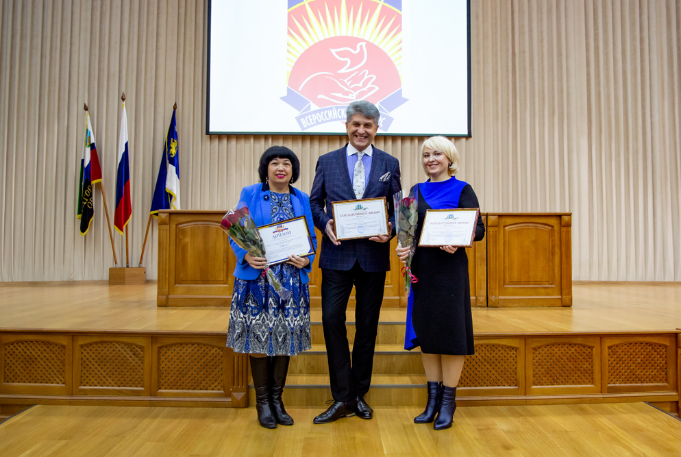 Университет на церемонии награждения представляли проректор по воспитательной работе и молодежной политике Светлана Острикова, директор департамента социальной политики Татьяна Никулина, непосредственно отвечающая за реализацию социальных программ в университете, и председатель профсоюзной организации НИУ «БелГУ» Валерий Тимофеев.