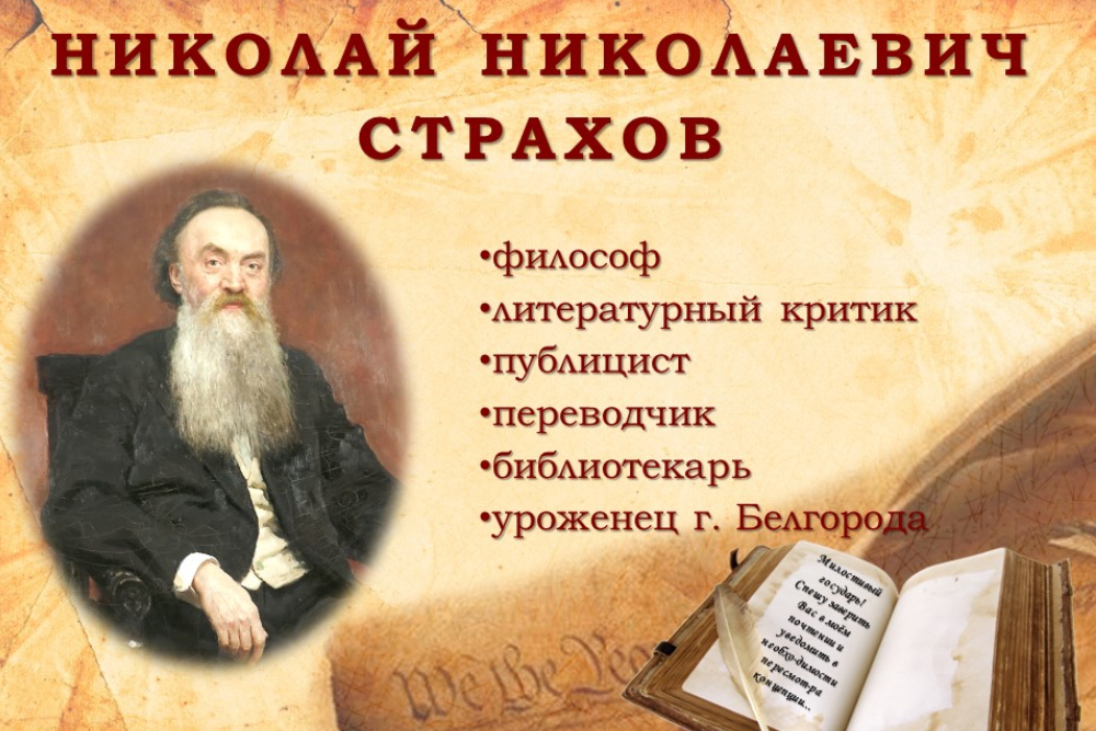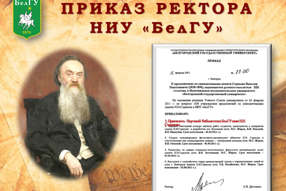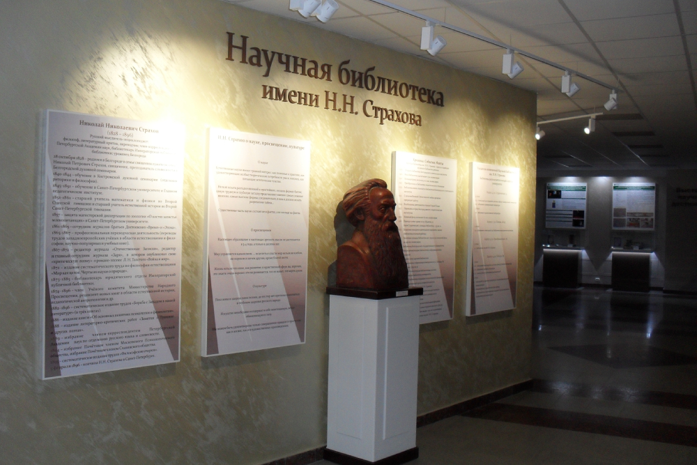 Для справки: В феврале 2011 года по итогам выполнения гранта Президента РФ для поддержки творческих проектов общенационального значения в области культуры и искусства решением ученого совета НИУ «БелГУ» Научной библиотеке присвоено имя Николая Николаевича Страхова – философа, публициста и просветителя, видного интеллектуала ХIХ века.