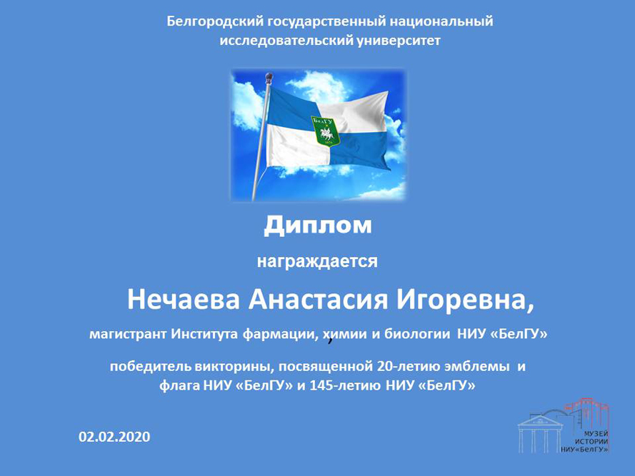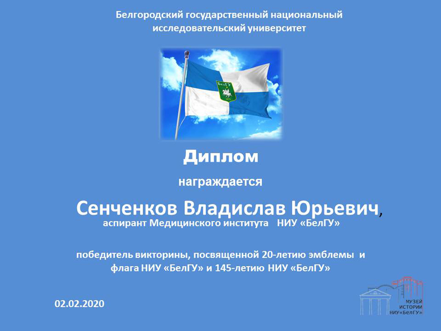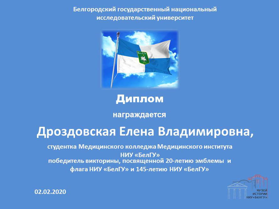 Для студентов университета была подготовлена онлайн-викторина, посвящённая символике НИУ «БелГУ». Участники отвечали на вопросы, связанные с историей геральдики и вексиллологии, историей появления флага и эмблемы университета. В викторине приняли участие студенты всех институтов и колледжей вуза. Победителями стали - Владислав Сенченков (медицинский институт), Анастасия Нечаева (институт фармации химии и биологии), Елена Дроздовская (медицинский колледж медицинского института).