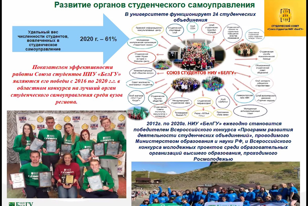 Андрей Пересыпкин сообщил, что в прошлом году НИУ «БелГУ» вошёл в ТОП-6 вузов-участников по проценту выполненных показателей с результатом 85,7% при подведении Министерством науки и высшего образования итогов реализации проекта по формированию в российской системе высшей школы сети национальных исследовательских университетов. По словам докладчика, задачи, поставленные в 2013 году выполнены. Об этом свидетельствует то, что с 2016 года НИУ «БелГУ» входит в 20 лучших вузов России в национальном рейтинге университетов международной информационной группы «Интерфакс», кроме того Белгородский госуниверситет вошёл в премьер-лигу российских университетов, состоящую из 25 вузов. Вуз занимает прочные позиции в ТОП-100 лучших университетов мира в Шанхайском предметном рейтинге по направлению «Металлургический инжиниринг».