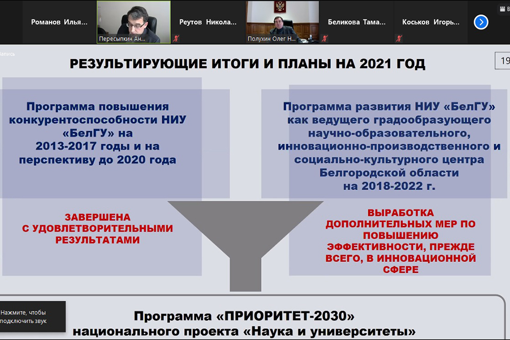 В ходе доклада речь также шла о программе развития вуза как градообразующего, научно-образовательного, инновационно-производственного и социально-культурного центра Белгородской области на 2018-2022 годы и её индикаторах. Андрей Петрович сообщил, что лишь четыре из 27 показателей не были выполнены по объективным причинам: ограничения, связанные с пандемией, отразились на международной и образовательной деятельности. В ходе обсуждения были высказаны мнения о том, что Программа повышения конкурентоспособности НИУ «БелГУ» во многом определила управленческие решения, обеспечившие поступательное динамичное развитие и рост репутации университета в мировом образовательном пространстве, в этот период была заложена основа для успешного участия в новых проектах – в первую очередь в программе стратегического академического лидерства «Приоритет-2030» и программе НОЦ мирового уровня «Инновационные решения в АПК».