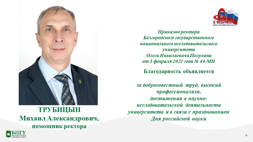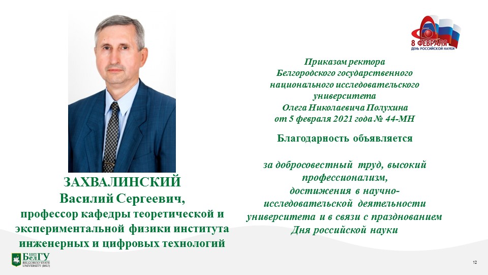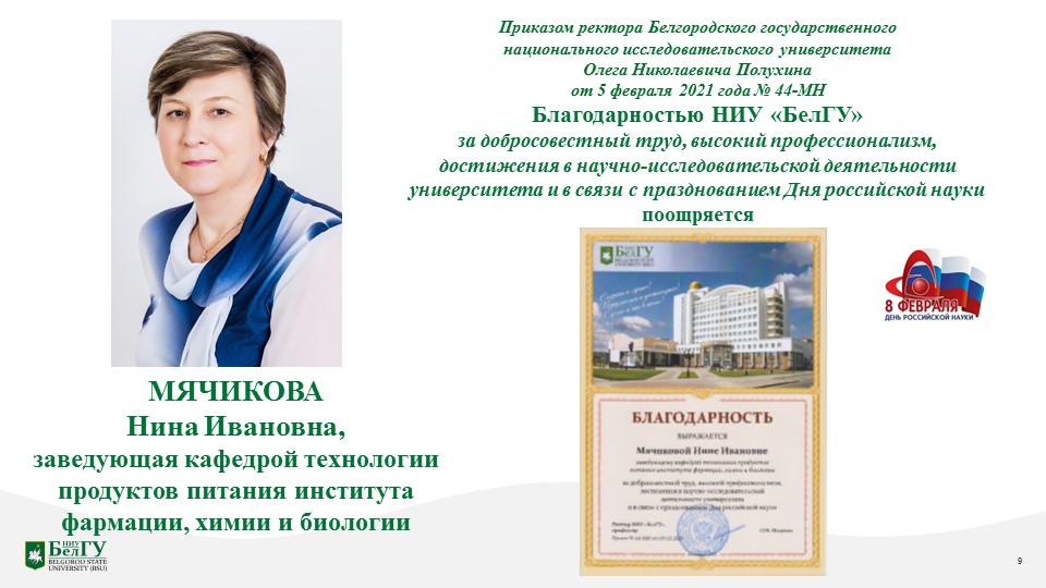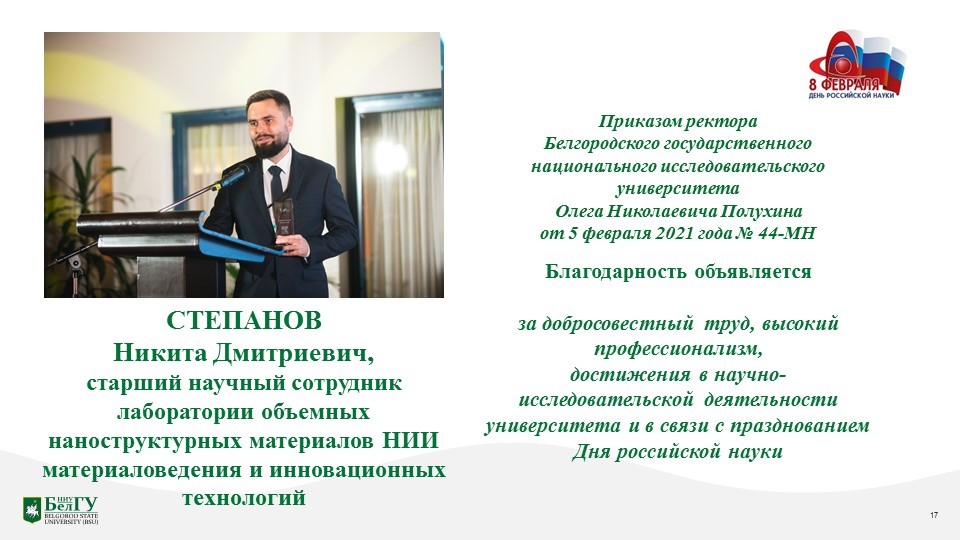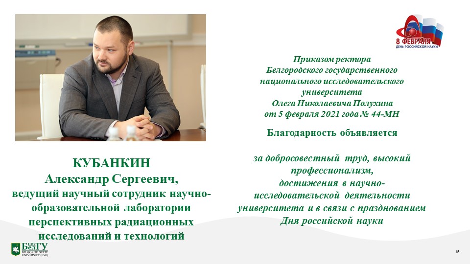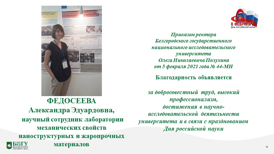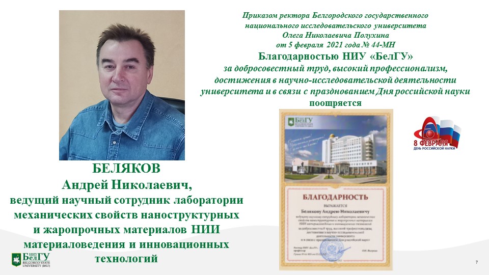 Благодарностями НИУ «БелГУ» за добросовестный труд, высокий профессионализм, достижения в научно-исследовательской деятельности университета и в связи с празднованием Дня российской науки поощрены ведущий научный сотрудник лаборатории механических свойств наноструктурных и жаропрочных материалов НИИ материаловедения и инновационных технологий Андрей Беляков, доцент кафедры педагогики факультета психологии педагогического института Елена Ерошенкова, заведующая кафедрой технологии продуктов питания института фармации, химии и биологии Нина Мячикова, директор научно-образовательного центра «Ботанический сад НИУ «БелГУ» природно-ландшафтного комплекса «Ботанический сад НИУ «БелГУ» Валерий Тохтарь, заведующий кафедрой медико-биологических дисциплин медицинского института Михаил Чурносов, профессор кафедры теоретической и экспериментальной физики института инженерных и цифровых технологий Василий Захвалинский, доцент кафедры общей химии института фармации, химии и биологии Ульяна Круть, ведущий научный сотрудник научно-образовательной лаборатории перспективных радиационных исследований и технологий Александр Кубанкин, доцент кафедры конституционного и международного права юридического института Алевтина Новикова, старший научный сотрудник лаборатории объемных наноструктурных материалов НИИ материаловедения и инновационных технологий Никита Степанов, помощник ректора Михаил Трубицын, научный сотрудник лаборатории механических свойств наноструктурных и жаропрочных материалов Александра Федосеева и заведующая кафедрой социологии и организации работы с молодежью института общественных наук и массовых коммуникаций Инна Шаповалова.