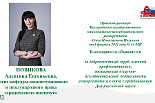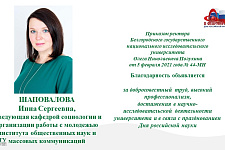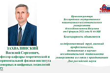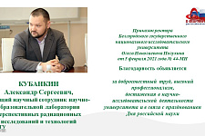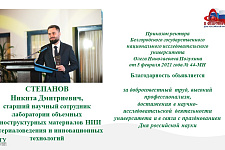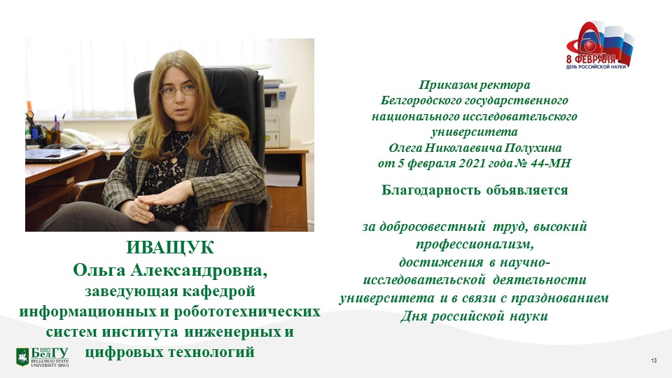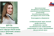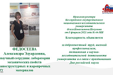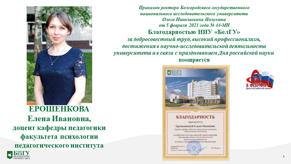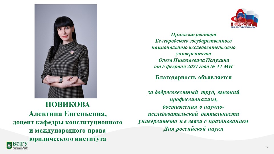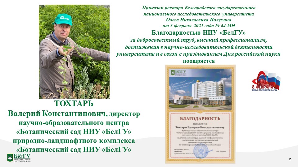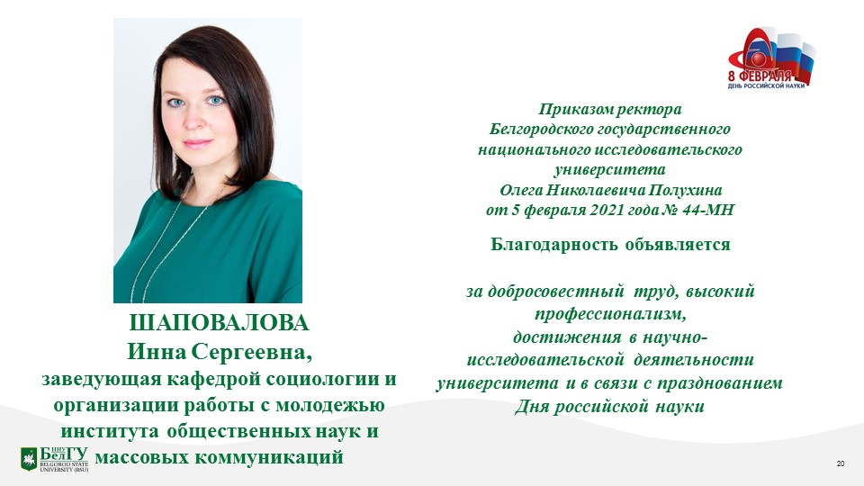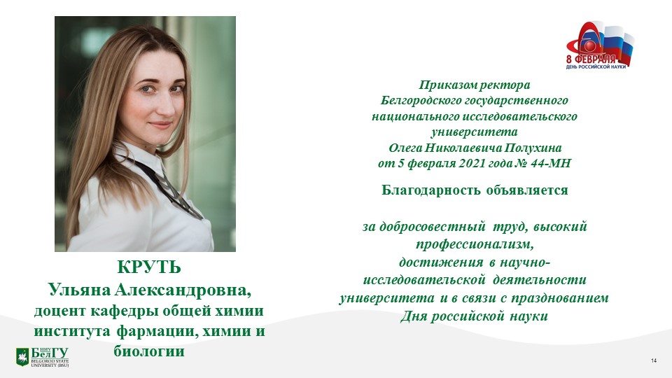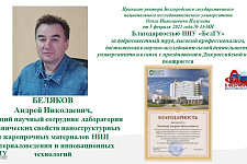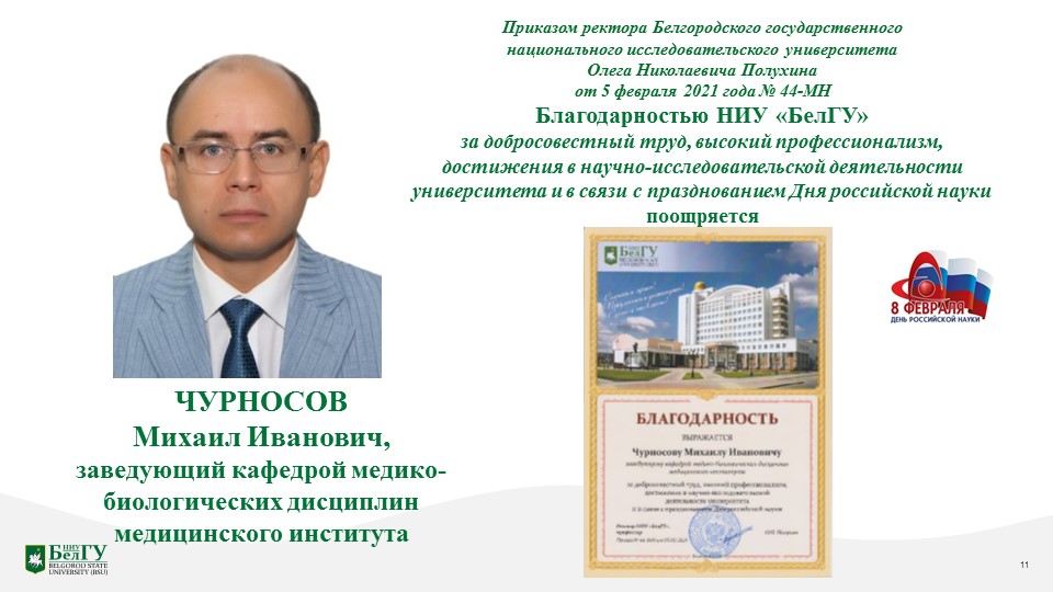 Благодарностями НИУ «БелГУ» за добросовестный труд, высокий профессионализм, достижения в научно-исследовательской деятельности университета и в связи с празднованием Дня российской науки поощрены ведущий научный сотрудник лаборатории механических свойств наноструктурных и жаропрочных материалов НИИ материаловедения и инновационных технологий Андрей Беляков, доцент кафедры педагогики факультета психологии педагогического института Елена Ерошенкова, заведующая кафедрой технологии продуктов питания института фармации, химии и биологии Нина Мячикова, директор научно-образовательного центра «Ботанический сад НИУ «БелГУ» природно-ландшафтного комплекса «Ботанический сад НИУ «БелГУ» Валерий Тохтарь, заведующий кафедрой медико-биологических дисциплин медицинского института Михаил Чурносов, профессор кафедры теоретической и экспериментальной физики института инженерных и цифровых технологий Василий Захвалинский, доцент кафедры общей химии института фармации, химии и биологии Ульяна Круть, ведущий научный сотрудник научно-образовательной лаборатории перспективных радиационных исследований и технологий Александр Кубанкин, доцент кафедры конституционного и международного права юридического института Алевтина Новикова, старший научный сотрудник лаборатории объемных наноструктурных материалов НИИ материаловедения и инновационных технологий Никита Степанов, помощник ректора Михаил Трубицын, научный сотрудник лаборатории механических свойств наноструктурных и жаропрочных материалов Александра Федосеева и заведующая кафедрой социологии и организации работы с молодежью института общественных наук и массовых коммуникаций Инна Шаповалова.