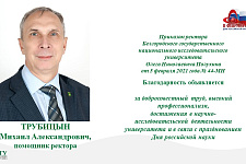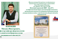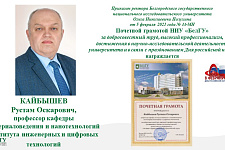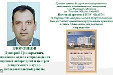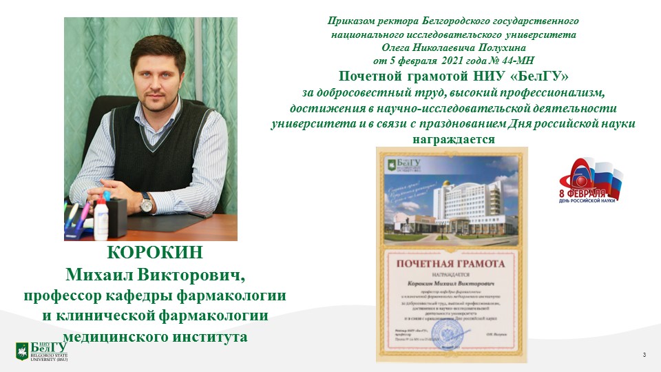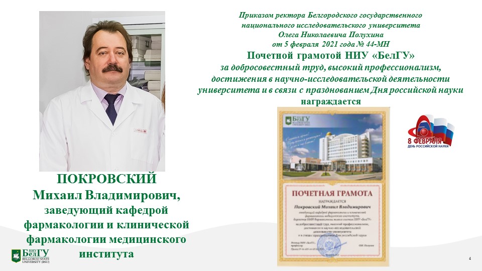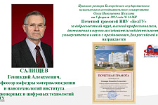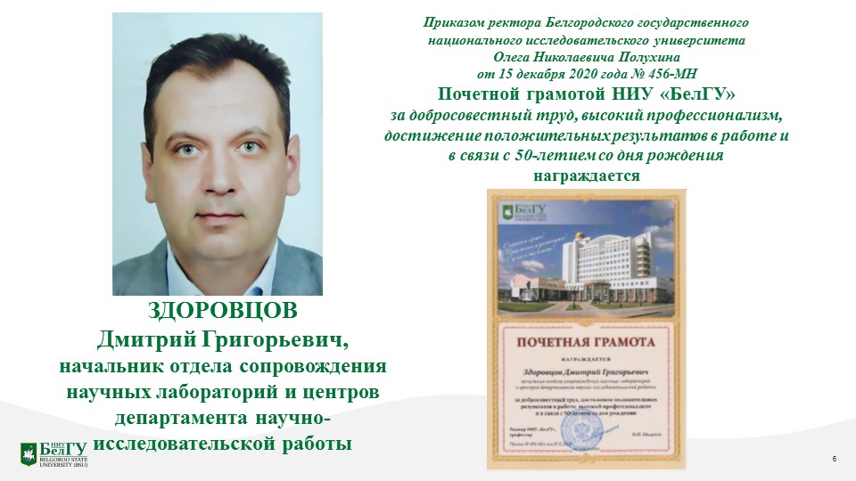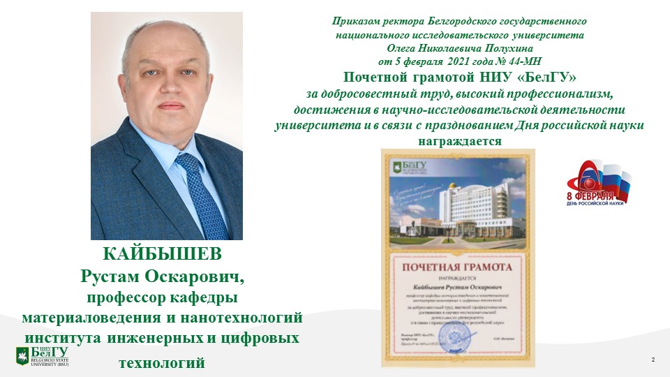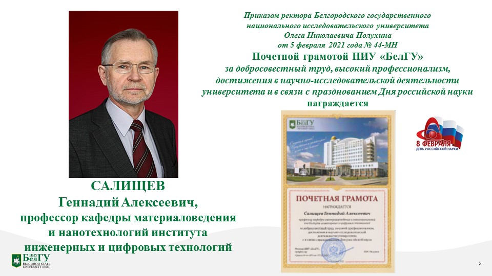 За добросовестный труд, высокий профессионализм, достижения в научно-исследовательской деятельности университета и в связи с празднованием Дня российской науки Почётными грамотами НИУ «БелГУ» были награждены профессор кафедры материаловедения и нанотехнологий института инженерных и цифровых технологий Рустам Кайбышев, профессор кафедры фармакологии и клинической фармакологии медицинского института Михаил Корокин, заведующий кафедрой фармакологии и клинической фармакологии медицинского института Михаил Покровский, профессор кафедры материаловедения и нанотехнологий института инженерных и цифровых технологий Геннадий Салищев, начальник отдела сопровождения научных лабораторий и центров департамента научно-исследовательской работы Дмитрий Здоровцов.