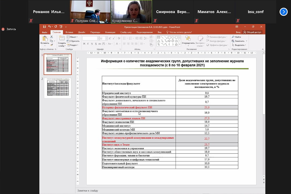 Ректор НИУ «БелГУ» Олег Полухин напомнил, что согласно подписанному им приказу с 8 февраля в университете осуществляется плавный переход к традиционному формату обучения, поэтому жесткого контроля посещаемости в этот период не должно быть. Олег Николаевич также обратил внимание на большое количество изменений, возникающих в расписании занятий, и дал поручение руководству МФЦ в тесном контакте с руководителями образовательных подразделений урегулировать все вопросы по замене преподавателей. Преподавателям старше 65 лет ректор рекомендовал оставаться в онлайн-режиме. Он также призвал руководителей образовательных подразделений усилить просветительскую деятельность, которая касается мер профилактики и вакцинации от коронавируса.