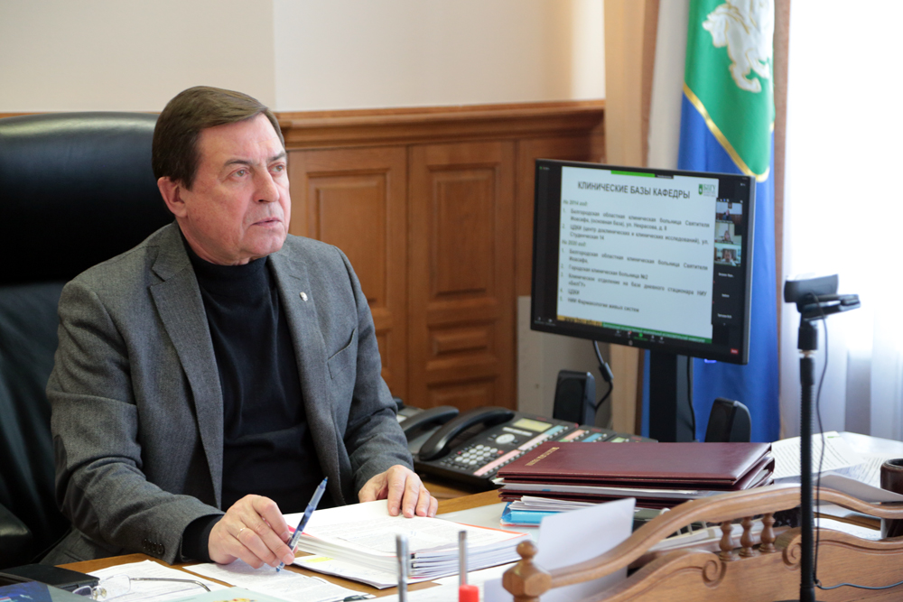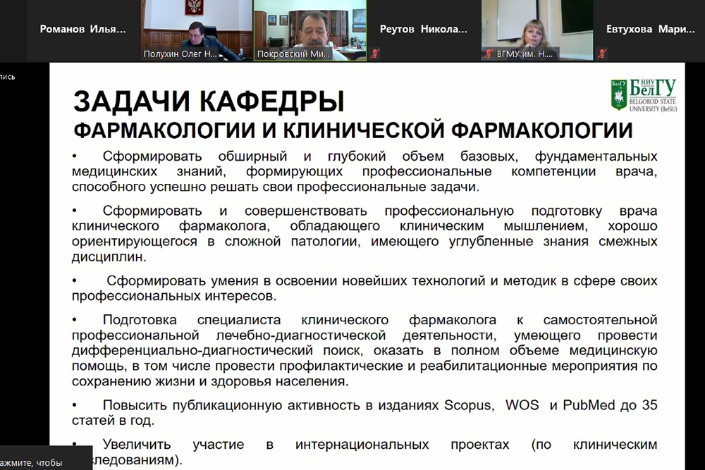Руководитель НИИ «Фармакологии живых систем», профессор Михаил Покровский рассказал о ходе реализации Программы развития кафедры фармакологии и клинической фармакологии на 2019-2022 гг. и поставленных задачах на 2021 год. Михаил Владимирович сообщил, что в структуре медицинского института кафедра появилась семь лет назад, и за эти годы руководством университета были сделаны серьёзные финансовые вложения в развитие этого структурного подразделения, созданы прекрасные условия для научной работы коллектива. Говоря об образовательной деятельности, руководитель кафедры отметил, что преподаватели разработали две программы ординатуры, программу по аспирантуре и по магистратуре. Он также подчеркнул, что все показатели за 2020 год были выполнены. Научное направление кафедры, по словам Михаила Владимировича, тесно связано с фармакологией. В 2020 году было опубликовано более 35 научных работ учёных в журналах, индексируемых в Scopus и WOS, 24 публикации в журналах из перечня ВАК. По словам Михаила Владимировича, стабилен прирост интеллектуальной собственности: только в прошлом году было выиграно 12 грантов Президента РФ и один грант РФФИ, проведено 15 доклинических исследований, завершено 9 исследований фармакокинетики и биоэквивалентности. Приоритетными задачами развития кафедры Михаил Владимирович назвал формирование университетской клиники генной терапии, привлечение ведущих учёных России в области молекулярной биологии и генетики для расширения научного и интеллектуального потенциала кафедры.