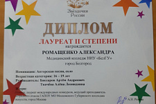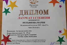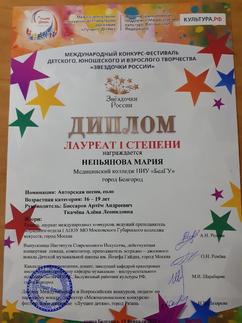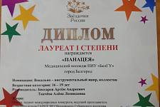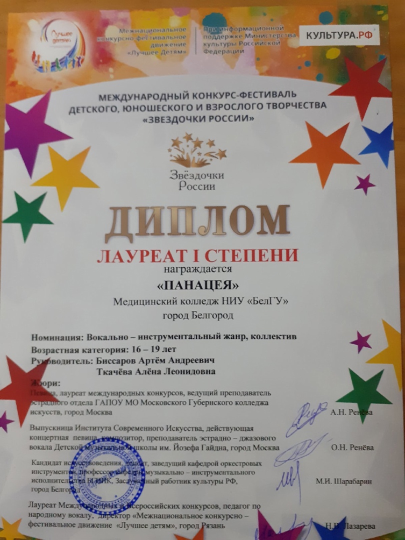 Музыкально-инструментальная группа «Панацея» медицинского колледжа медицинского института НИУ «БелГУ» стала лауреатом I степени конкурса в номинации «вокально-инструментальный жанр, ансамбль». В номинации «Авторская песня» лауреатами I и II степени стали студентки Мария Непьянова и Александра Ромащенко. Оценивали творчество студентов лауреат международных конкурсов, ведущий преподаватель эстрадного отдела Московского Губернского колледжа искусств Анна Ренёва, преподаватель эстрадно-джазового вокала Детской музыкальной школы им. Йозефа Гайдна Ольга Ренёва, заведующий кафедрой оркестровых инструментов, профессор кафедры музыкально-инструментального исполнительства БГИИК, Заслуженный работник культура РФ Михаил Шарабарин, директор «Межнациональное конкурсно-фестивальное движение «Лучшее детям» Наталья Лазарева.
