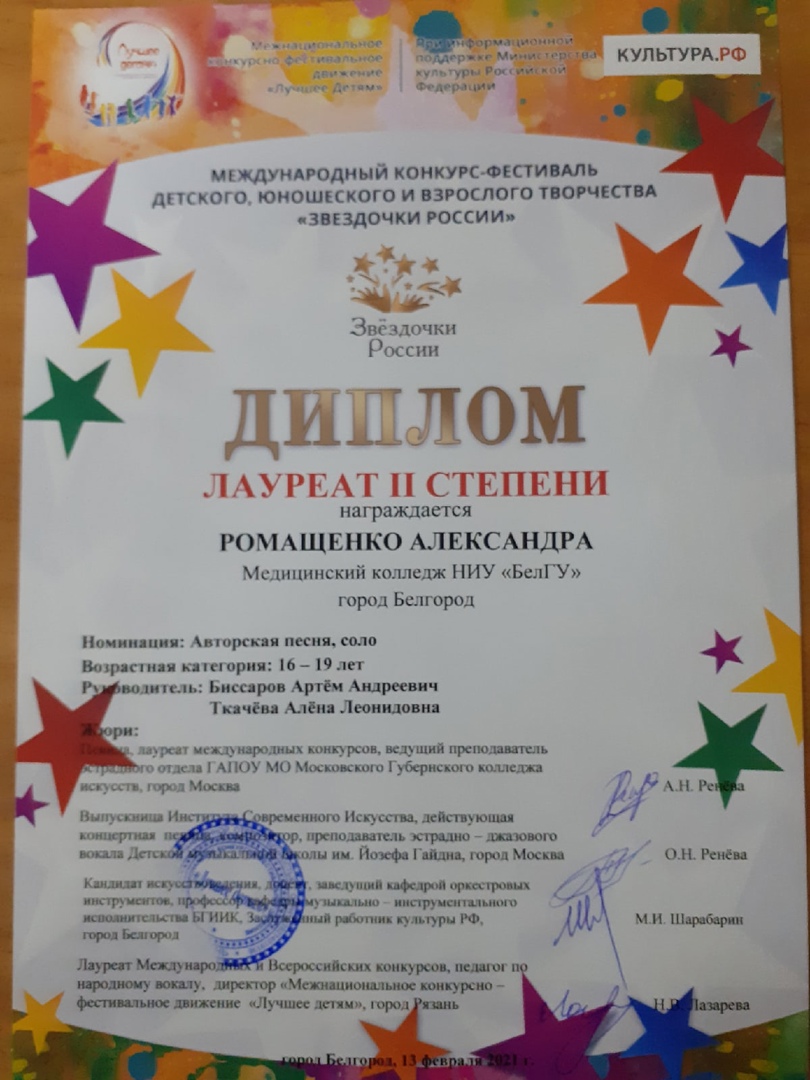 Студенты Белгородского госуниверситета стали лауреатами Международного конкурса-фестиваля детского, юношеского и взрослого творчества «Звёздочки России»