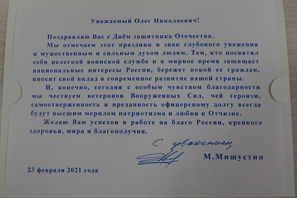 – С особым чувством благодарности мы чествуем ветеранов Вооружённых сил, чей героизм, самоотверженность и преданность офицерскому долгу всегда будут высшим мерилом патриотизма и любви к Отчизне. Желаю крепкого здоровья, мира, благополучия и успехов в работе на благо России, – говорится в тексте поздравления.
