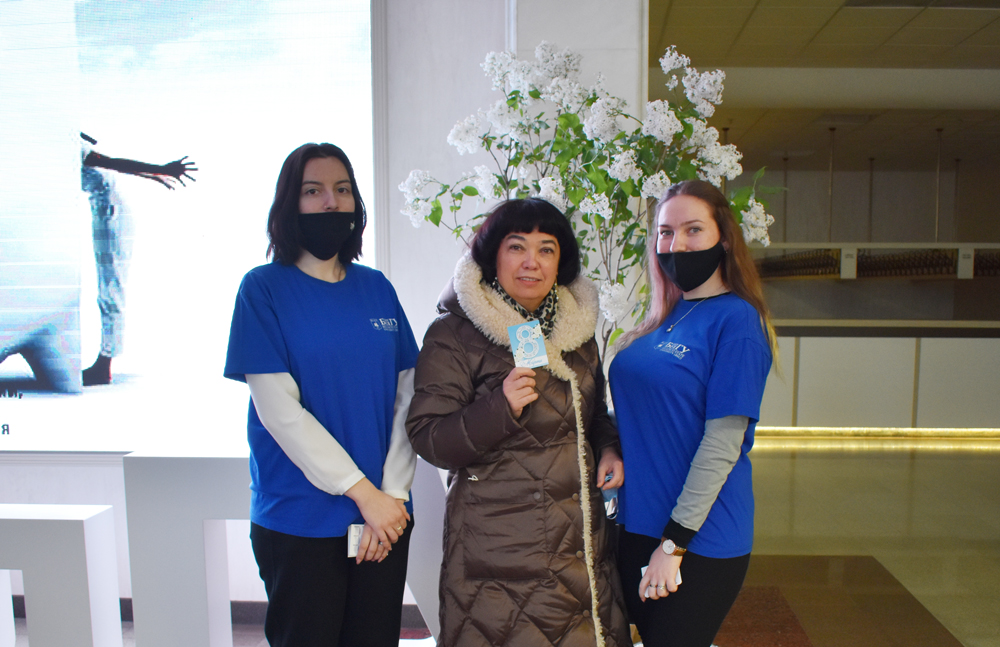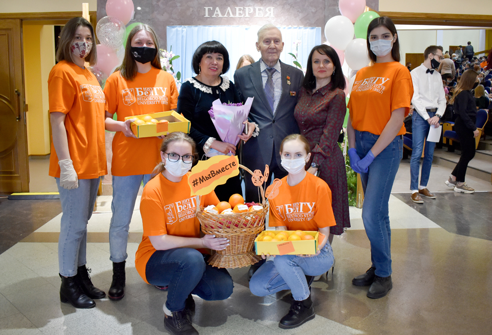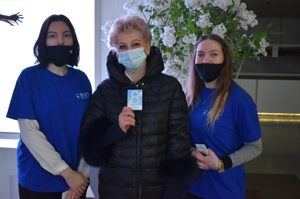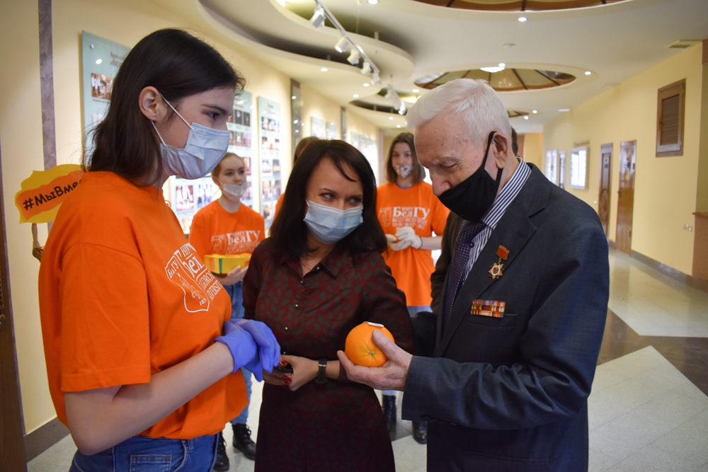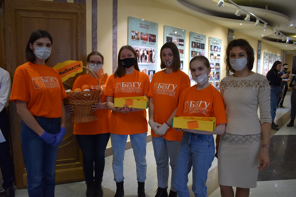 В холле молодёжного культурного центра перед праздничным концертом волонтёры акции «Мы вместе» дарили женщинам апельсины как символы пришествия весенних дней, наполненных яркими красками. Женщинам-ветеранам НИУ «БелГУ» студенты вручили праздничные цветы.