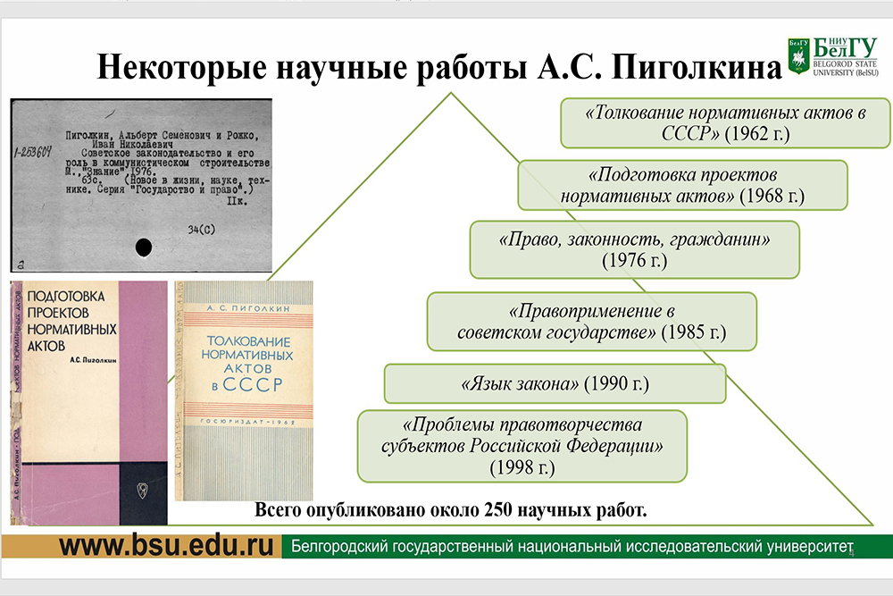 В своём докладе заведующий кафедрой теории и истории государства и права рассказал, что Альберт Пиголкин являлся одним из основоположников научного направления отечественной юриспруденции, связанного с исследованием языка закона, разработал их основные принципы, отстаивал перспективную возможность перехода к всеобщей кодификации российского законодательства.