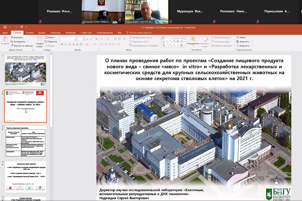 Директор научно-исследовательской лаборатории «Клеточные, вспомогательные репродуктивные и ДНК технологии» Сергей Надеждин сообщил о проведении работ по проектам «Создание пищевого продукта нового вида – свиное «мясо» in vitro» и «Разработка лекарственных и косметических средств для крупных сельскохозяйственных животных на основе секретома стволовых клеток». Руководитель проекта отметил, что первый проект прошёл утверждение на платформе биотехнологии и уже проработан с индустриальным партнером ГК "Агробелогорье": в 2021 году будет создан лабораторный образец свиного "мяса" in vitro, на 2022 год запланировано создание опытного образца, а первая опытная партия продукта будет произведена в 2023-2024 году. По словам Сергея Надеждина, главным результатом станет уникальный пищевой продукт – свиное «мясо» in vitro, представляющее клеточный фарш, пригодный для изготовления различных пищевых продуктов как в домашних, так и заводских условиях.