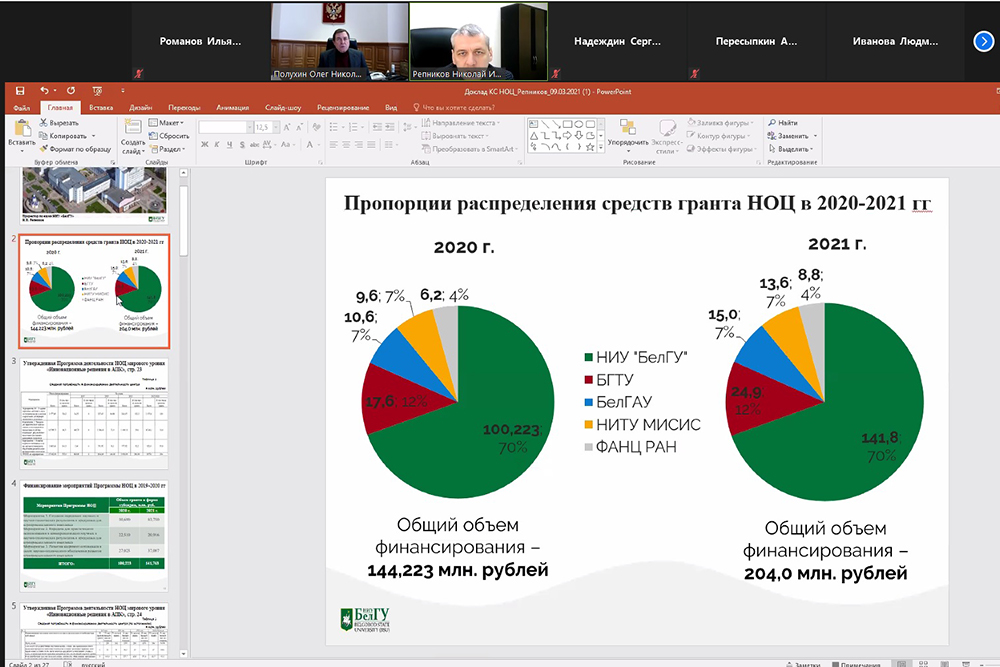 В ходе заседания были также рассмотрены вопросы финансирования университета по проектам НОЦ на 2021 год, создания новой структуры по эффективному участию НИУ «БелГУ» в реализации Программы деятельности НОЦ, а также обсуждались показатели научно-образовательного центра для университета на текущий год.
