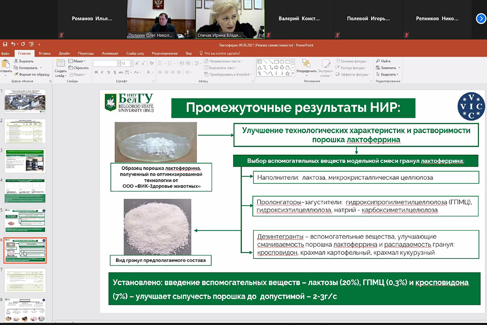 Директор института фармации, химии и биологии НИУ «БелГУ» Ирина Спичак представила информацию о проекте «Производство биологически-активных веществ (лактоферрина, лактопероксидазы и лактальбумина) из молочной сыворотки на территории Белгородской области» на 2021 год. Биологически активные вещества будут использованы при производстве ветеринарных препаратов, кормовых добавок, функционального питания, лекарственных и косметических средств. Как рассказала Ирина Владимировна, уже получены образцы лактоферрина и ведётся научно-исследовательская работа.