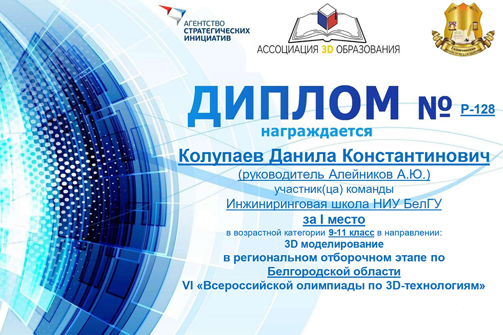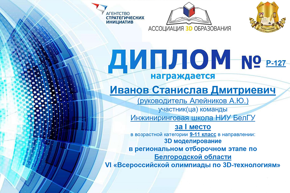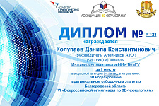 Учащиеся инжиниринговой школы НИУ «БелГУ» Данила Колупаев и Станислав Иванов стали победителями регионального отборочного этапа в возрастной категории 9-11 класс по направлению 3D-моделирование. Их руководитель Андрей Алейников подчеркнул, что 3D-моделирование помогает школьникам понять всю красоту инженерного творчества, развить трёхмерное мышление и учит серьёзно подходить к поставленной задаче. Победители представят Белгородскую область на всероссийском этапе олимпиады в ВДЦ «Смена», который состоится в Краснодарском крае с 29 марта по 11 апреля.