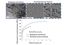 Говоря об особенностях перспективного сплава, ученый обращает внимание, что его механические свойства могут быть улучшены за счет простой термической обработки. Так, после высокотемпературного отжига прочность возрастает на 38 процентов, а пластичность – почти в три раза. Ученый поясняет, что термическая обработка сплава привела к формированию композито-подобной структуры, состоящей из пластин с гексагональной структурой, равномерно распределенных в матрице с кубической структурой. Одновременно высокая прочность и пластичность отожженного сплава обеспечивалась особым механизмом деформации