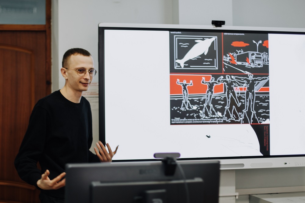 Выступление доцента кафедры журналистики Яна Тяжлова было посвящено российским медиа, их работе по привлечению внимания аудитории к местным и глобальным экологическим проблемам.