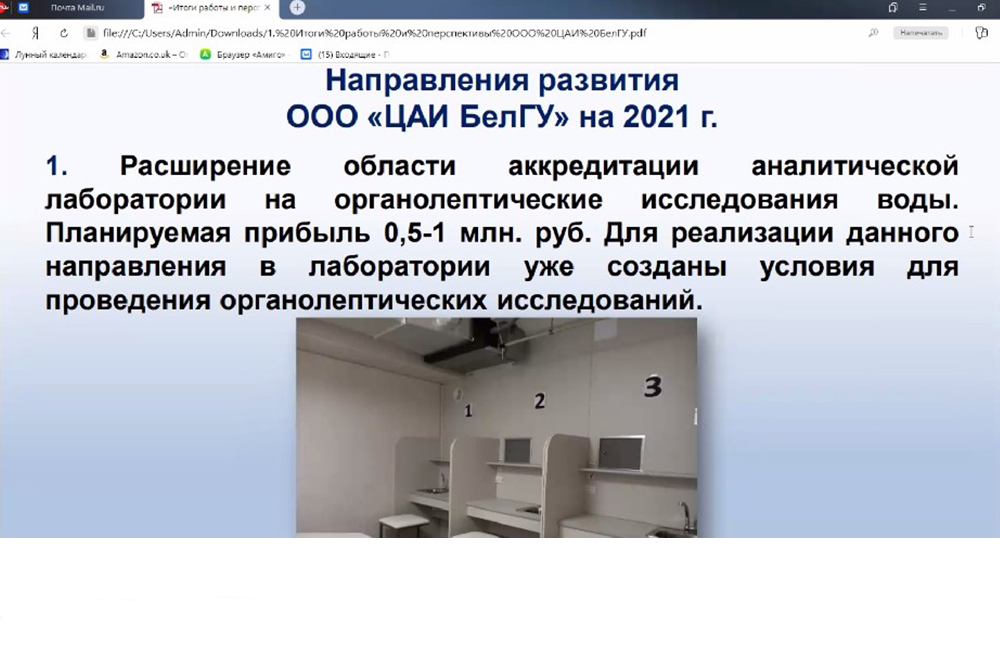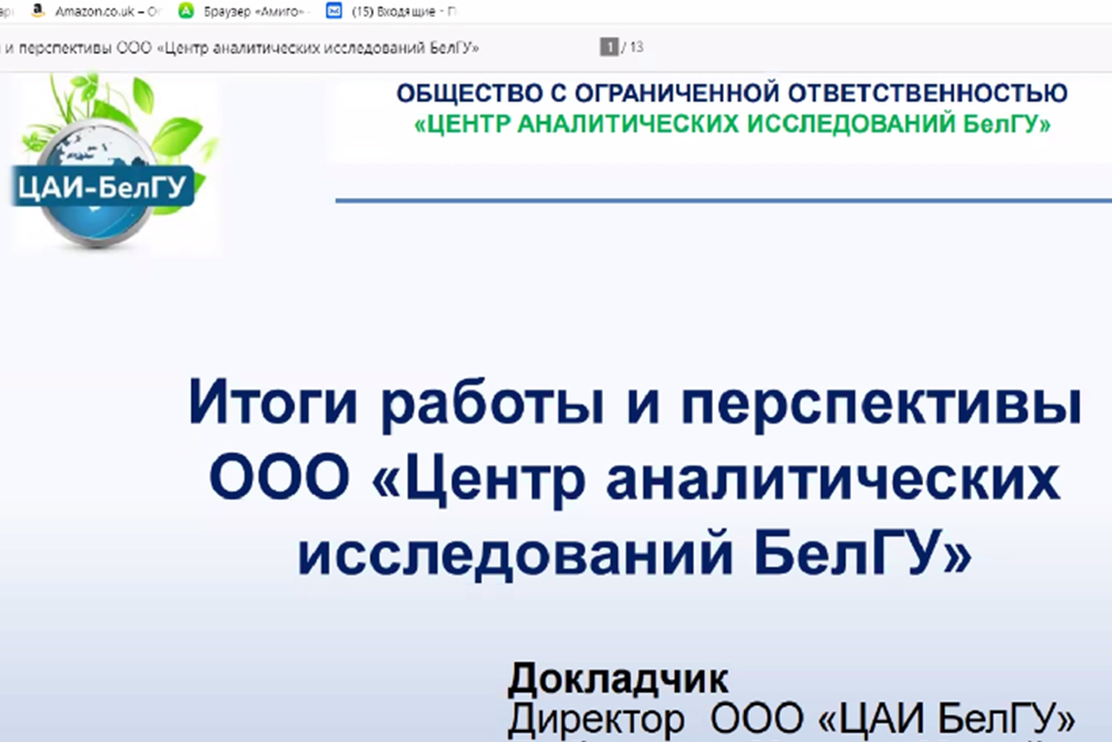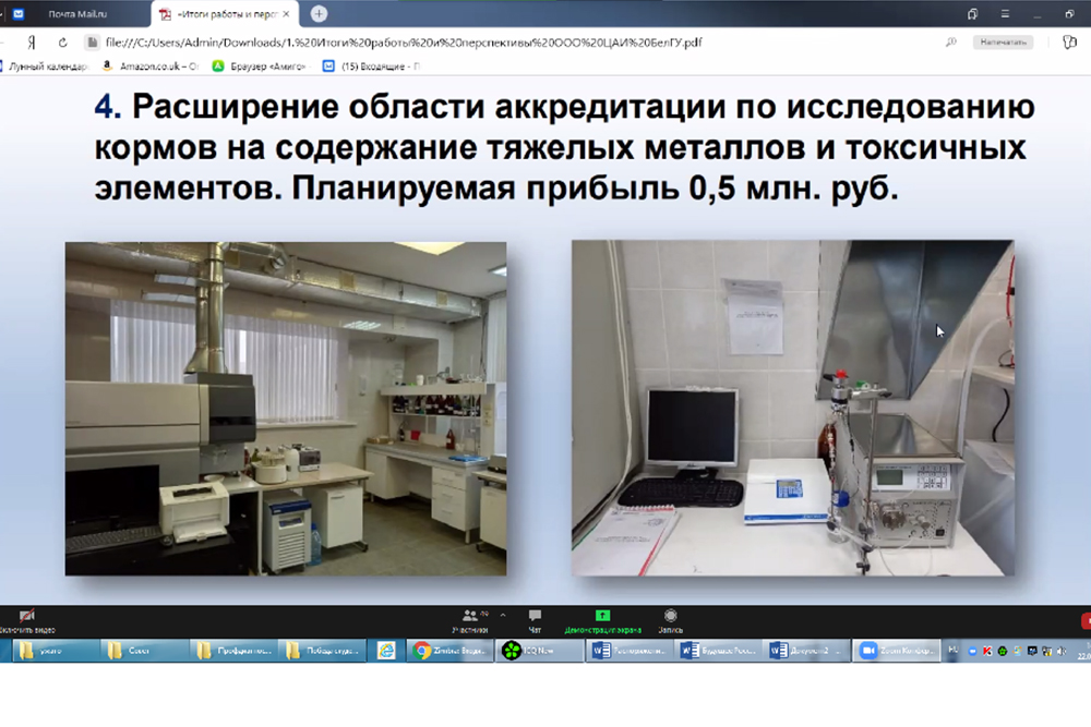 Заседание прошло под председательством проректора НИУ «БелГУ» по науке Николая Репникова в дистанционном формате. В ходе заседания были обсуждены итоги деятельности ООО «Центр аналитических исследований (ЦАИ) БелГУ» и намечены перспективы развития по различным направлениям. Руководитель ЦАИ БелГУ Михаил Побудилин отметил, что за прошедший год было заключено свыше 170 договоров с агропромышленными комплексами и предприятиями Белгородской области. Михаил Михайлович рассказал о планах по участию Центра в создании экологической карты Белгородской области и в проекте мониторинга парниковых газов на территории региона, обозначив перспективное направление по расширению области аккредитации аналитической лаборатории на органолептические исследования воды. Планируемые исследования, по словам Михаила Побудилина, будут приносить ежегодный доход до миллиона рублей. Среди перспектив – агрохимические исследования почвы, кормов на содержание тяжелых металлов и токсичных элементов, расширение показателей исследования воды, атмосферного воздуха и промышленных выбросов.
