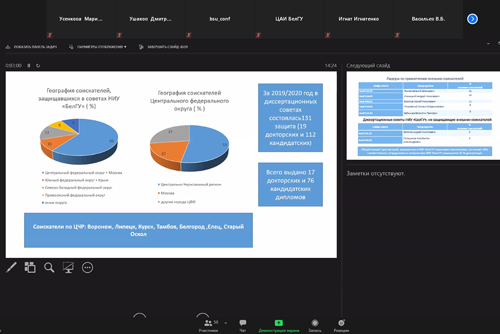 На заседании был рассмотрен вопрос о функционировании системы самостоятельного присуждения ученых степеней в НИУ «БелГУ». Анализируя результаты работы в 2020 году, проректор по науке Николай Репников отметил, что динамика развития сети диссертационных советов в целом положительна и подчеркнул, что в приоритете для задача кадрового воспроизводства НИУ «БелГУ».