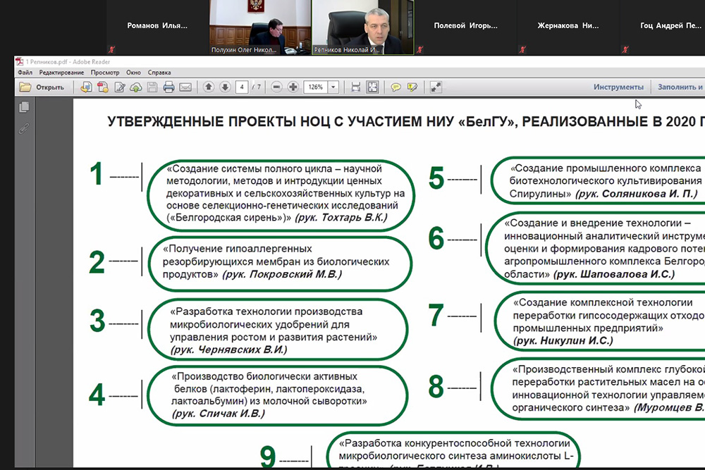 Выступивший с отчётом о деятельности НИУ «БелГУ» по выполнению программы НОЦ «Инновационные решения в АПК» в 2020 году проректор по науке Николай Репников сообщил, что все поставленные перед университетом задачи были выполнены в полном объёме. По мнению Николая Ивановича, главным результатом работы стало обеспечение университетом научной составляющей в девяти проектах НОЦ. Значения таких показателей, как количество патентов на изобретения, количество статей, индексируемых в международных базах данных «Scopus» и Web of Science», были перевыполнены. Значимым итогом 2020 года стало открытие лаборатории геномного редактирования и начало её оснащения современным оборудованием, а также создание в структуре университета офиса распределённого центра коллективного пользования НОЦ и центра управления проектами, реализуемыми с участием вуза. Как отметил содокладчик, проректор по реализации программ стратегического развития Андрей Пересыпкин, большая работа в 2020 году была проделана университетом по популяризации результатов НОЦ: более пятисот информационных материалов было опубликовано в федеральных и региональных СМИ и в соцсетях.
