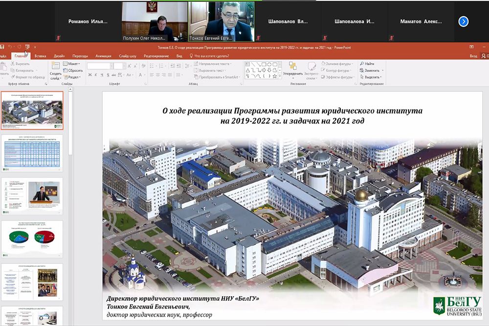 На заседании учёного совета была также рассмотрена и утверждена актуализированная Программа развития юридического института, которую представил его руководитель Евгений Тонков. Члены ученого совета одобрили план мероприятий по реализации программы развития юридического института по всем направлениям деятельности. Приоритетными направлениями работы в 2021 году названы разработка и реализация сетевой образовательной программы с Башкирским государственным университетом, открытие магистерской программы «Правовое сопровождение предпринимательской деятельности» на английском языке, усиление взаимодействия с работодателями по целевой контрактной подготовке, сотрудничество с Институтом государства и права РАН, дальнейшее развитие академической мобильности.