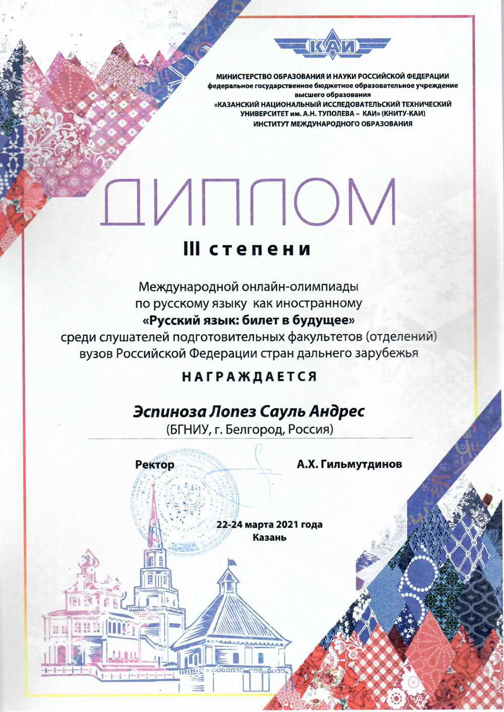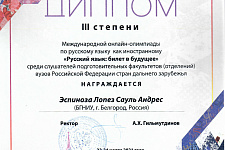 Слушатель подготовительного факультета Эспиноза Лопез Сауль Андрес из Эквадора занял третье место в международной онлайн-олимпиаде по русскому языку как иностранному «Русский язык: билет в будущее»