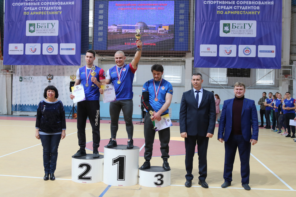 Соревнования проводились как в личном первенстве, так и в командном зачёте. В личном первенстве победителями в разных весовых категориях стали магистранты – члены Ассоциации выпускников НИУ «БелГУ»: Никита Меркер (85 кг), Михаил Кудряшов (90 кг), Кирилл Белюсев (100 кг) и Давид Шамей (110 кг). Среди девушек равных не было студентке первого курса факультета физической культуры Софии Клименко (50 кг). Еще несколько спортсменов заняли вторые и третье места. В общей сложности в личном зачёте у армрестлеров НИУ «БелГУ» 15 призовых мест.