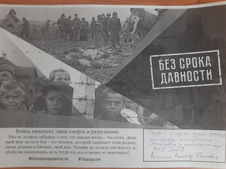 Обучающиеся институтов и колледжей университета ознакомились c видеофильмом «Без срока давности», из которого узнали о масштабах и характере преступлений нацистов в отношении мирных жителей оккупированных территорий, узнали правовую оценку с исторической и современной точек зрения.