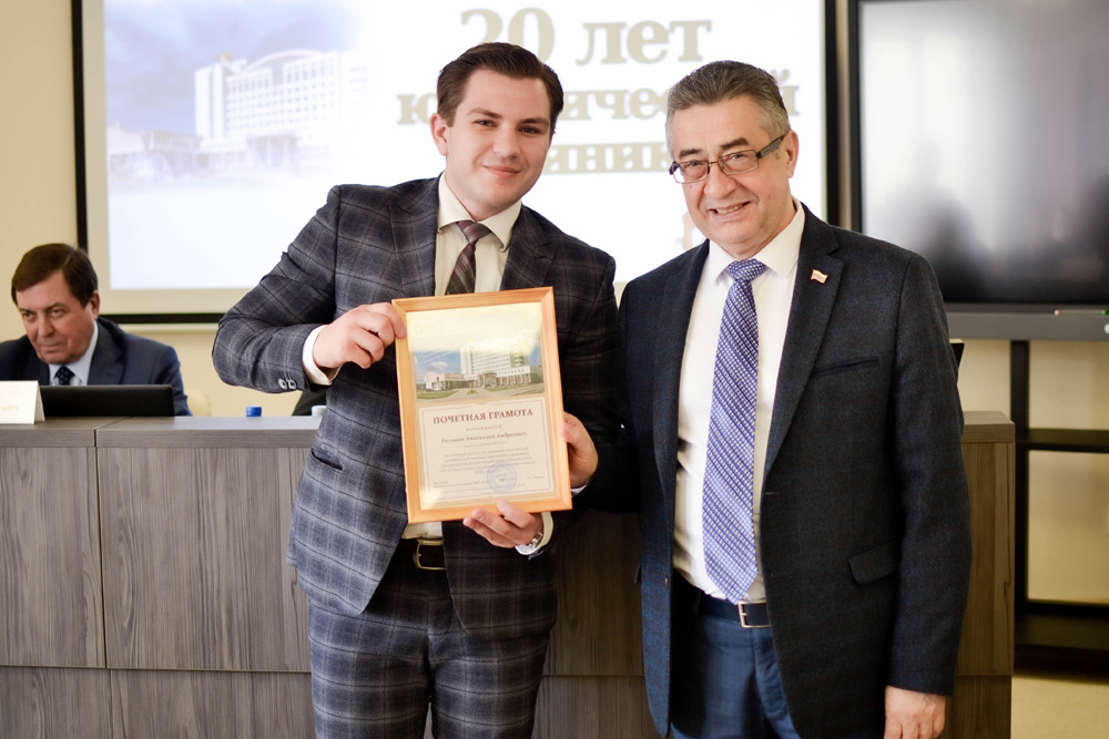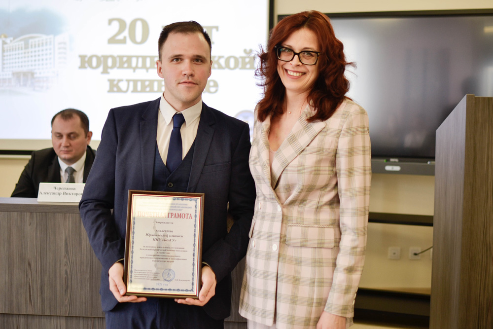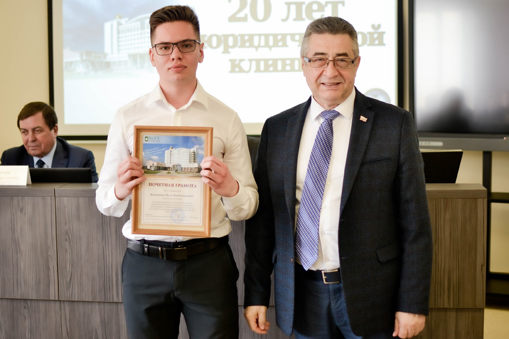 Руководитель юридической клиники НИУ «БелГУ», доцент кафедры гражданского права и процесса Максим Зинковский представил собравшимся основные направления деятельности – это правовое консультирование, составление ходатайств и заявлений, представительство в судах. От имени выпускников юридического института, в разное время возглавлявших юридическую клинику, к присутствующим обратился Дмитрий Таряник, отметивший высокий уровень подготовки юридических кадров. Представителям коллектива юридической клиники были вручены Почётные грамоты НИУ «БелГУ».