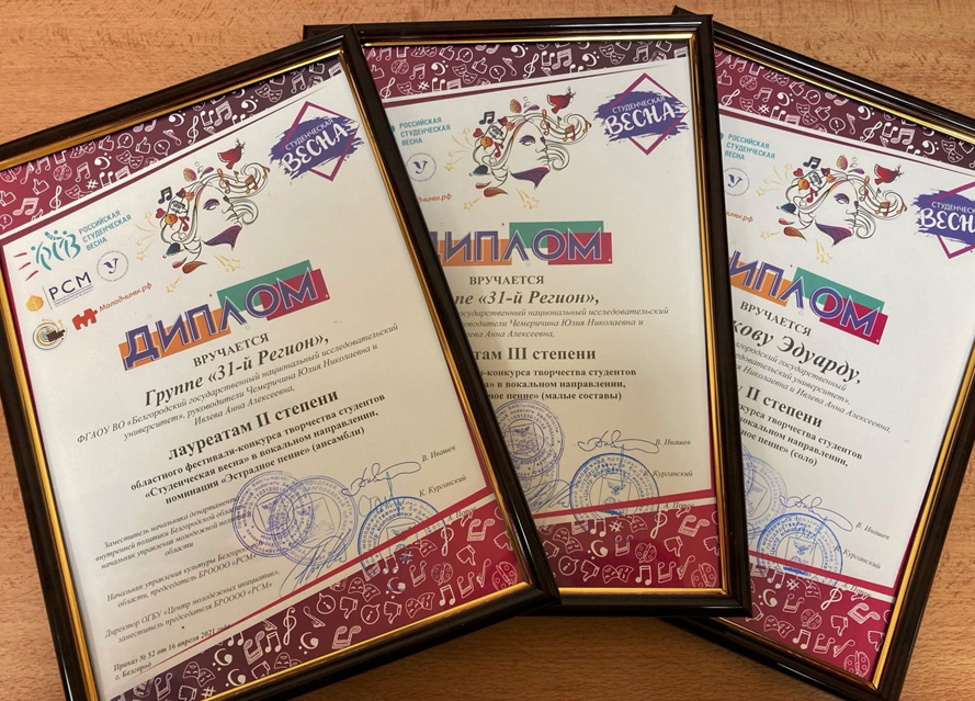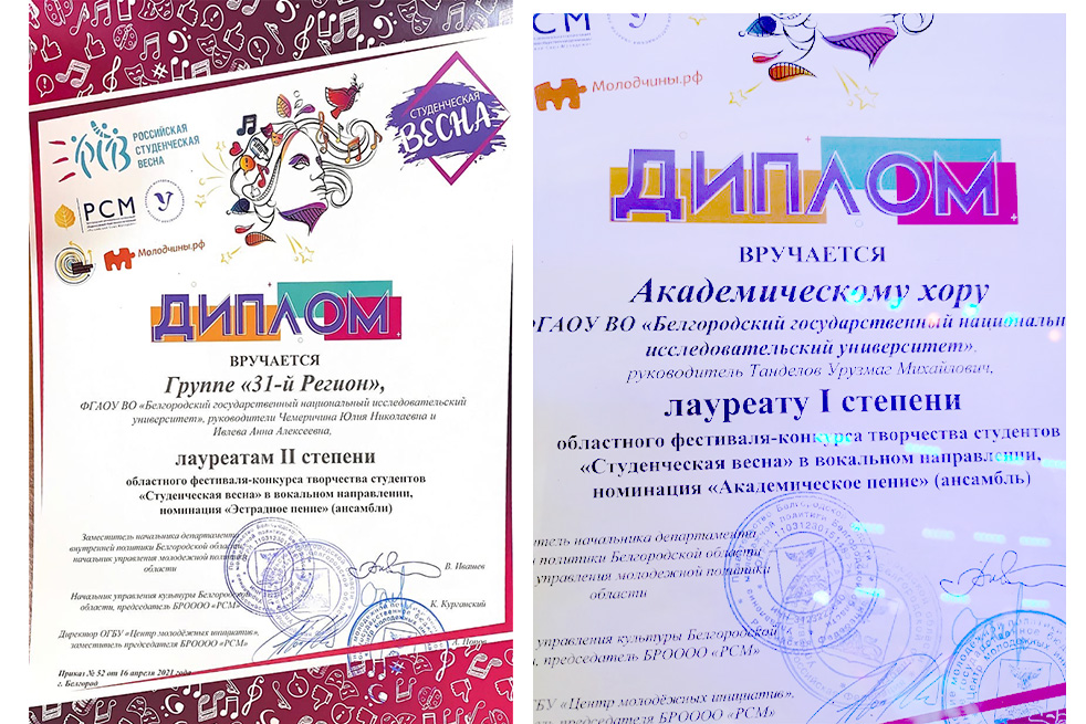 Региональный этап фестиваля-конкурса «Студенческая весна-2021» собрал на площадке БГТУ им. В.Г. Шухова более ста креативных, ярких представителей вузов и ссузов области. Честь Белгородского госуниверситета защищали несколько творческих коллективов. Дипломов I степени регионального этапа конкурса удостоены вокальный джазовый ансамбль и академический хор (рук. У. Танделов), ансамбль народного танца «Забава», вокально-инструментальный ансамбль «Панацея», солист вокальной студии «Альянс» Серджио Ромеро, солисты студии инструментальной музыки Олег Низиёв, Евгения Фархутдинова, представитель студенческого театра эстрадных миниатюр «Фабула» Александр Анисимов. Дипломантами II степени стали группа «31-й регион», Эдуард Бирюков и представительница студенческого театра эстрадных миниатюр «Фабула» Софья Богомаз. Дипломантом III степени оказалась группа «31-й регион».