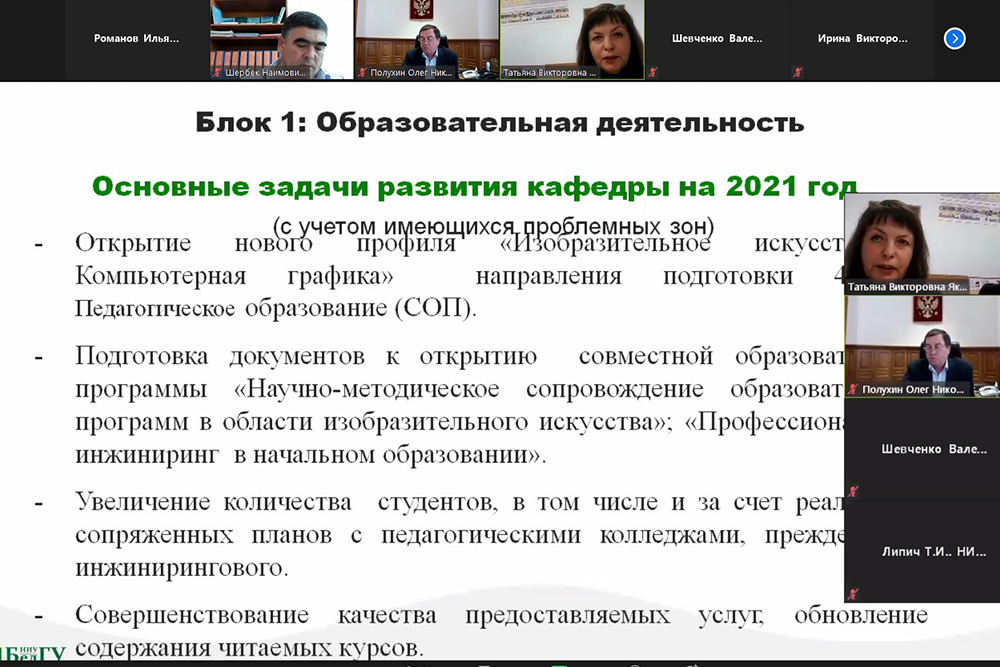 О реализации программы развития кафедры теории, педагогики и методики начального образования и изобразительного искусства на 2019/2022 гг. и задачах на 2021 год сообщила заведующая кафедрой Татьяна Яковлева. Она отметила основные достижения и показатели, сделав акцент на перспективных направлениях деятельности, и, прежде всего, на развитии стратегического партнёрства в рамках международного сотрудничества.