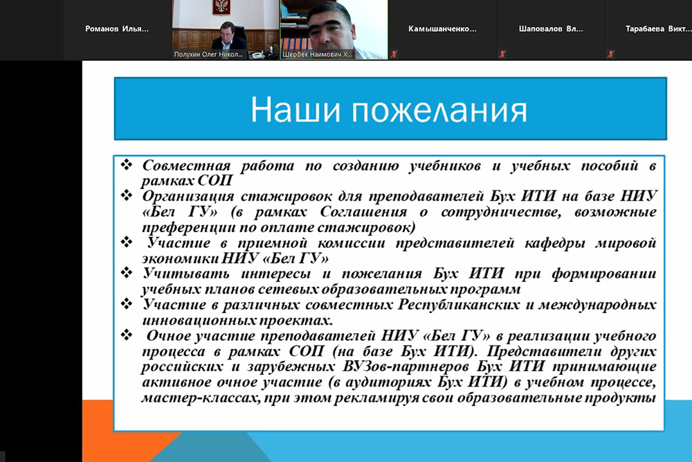 О реализации программы развития кафедры мировой экономики на 2019/2022 гг. и задачах на 2021 год доложила завкафедрой Елена Камышанченко. Она подчеркнула, что на сегодняшний день 78% обучающихся по направлениям подготовки кафедры составляют иностранные студенты. В планах развития кафедры — расширение международного межвузовского партнёрства с открытием новых сетевых программ, а также набор иностранных студентов, обучающихся на английском языке. Особое внимание будет уделено профориентационной работе. По мнению внешнего эксперта по вопросу международного сотрудничества, заведующего кафедрой менеджмента Бухарского инженерно-технологического института, кандидат экономических наук, доцента Шербека Хайитова, у кафедры есть потенциал для развития сетевых образовательных программ с зарубежными вузами-партнёрами. К числу, наряду с Бухарским инженерно-технологическим институтом, относятся Бременский университет (Германия), университет Серж-Понтуаз (Франция), Дэчжоуский, а также Пекинский нефтяной университеты (КНР) и др.