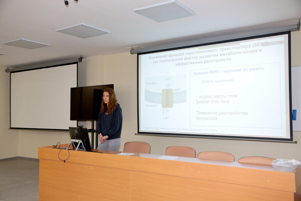 Анна Горлова представила результаты исследований, связанных с изучением степени воздействия ряда фармпрепаратов, в том числе с использованием стволовых клеток, при определённых патологиях (боковой амиотрофический склероз) на моделях FUS-трансгенных и TpH2-гетерозиготных мышей. Научная работа Екатерины Вениаминовой посвящена влиянию определённой диеты на метаболизм и нейробиологические параметры в моделях на мышах, а также моделированию нейропсихиатрических патологий с использованием генетически модифицированных животных.