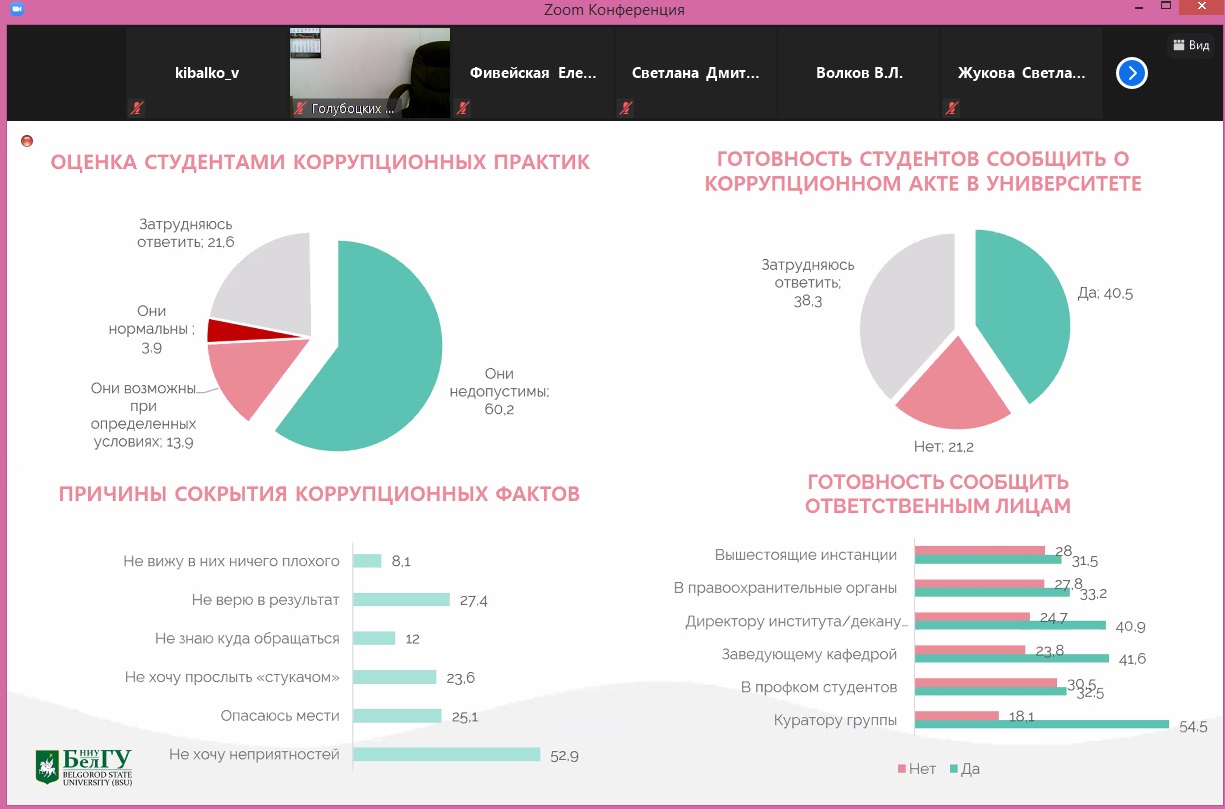 Заведующая кафедрой социологии и организации работы с молодёжью Инна Шаповалова представила результаты двух крупных социологических исследований. Первое было направлено на изучение проблемы вовлеченности в проблемы экстремизма студентов НИУ «БелГУ». Исследование выявило ряд проблем, главной среди которых можно назвать отсутствие правовой культуры: многие представители студенчества не знают, что является законным, а что нет – как в контексте действий, так и в контексте высказываний. Инна Сергеевна прокомментировала также результаты социологического исследования «Антикоррупционная политика университета», где были отмечены и основные причины коррупционных практик, их формы, отношение к ним как студентов, так и сотрудников. В исследовании отмечается ярко выраженная положительная динамика в области снижения коррупционных предложений.