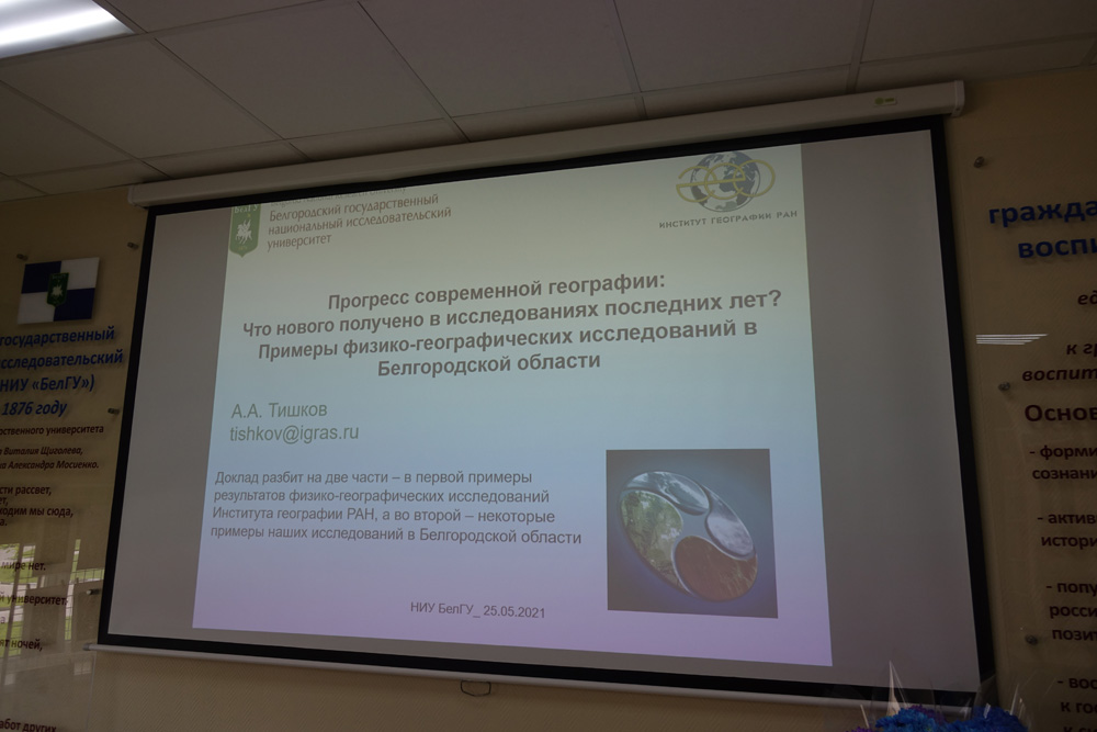 В институте наук о Земле состоялся научный семинар с участием члена-корреспондента РАН, доктора географических наук, заместителя директора по научным вопросам Института географии РАН Аркадия Тишкова. На примере исследований последних лет института географии РАН на просторах Северной Евразии, в том числе и в Белгородской области, он показал успехи отдельных направлений физической географии – биогеографии, гидрологии, палеогеографии и ландшафтоведения.
